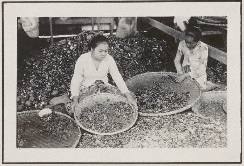 Het sorteren van het zaad van een damarboom (Agathis...