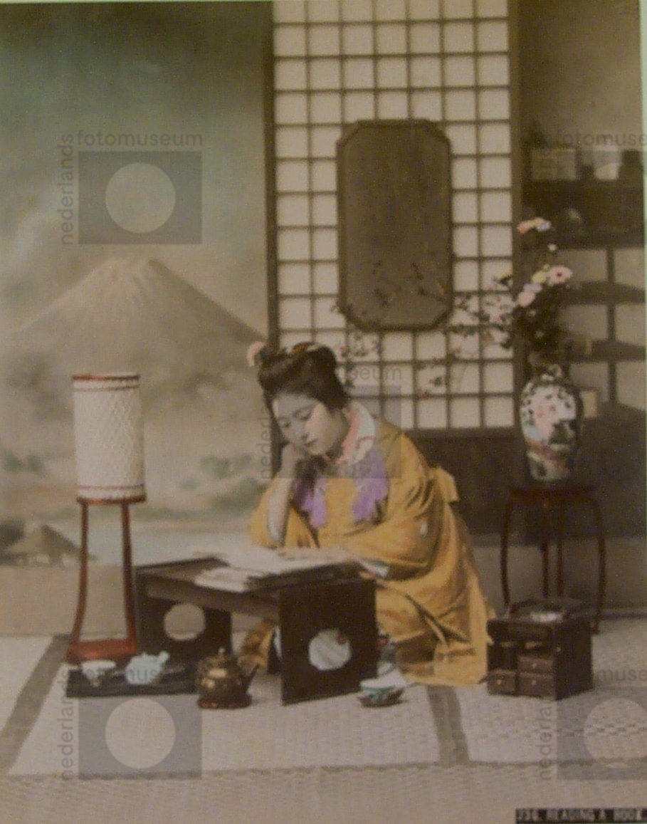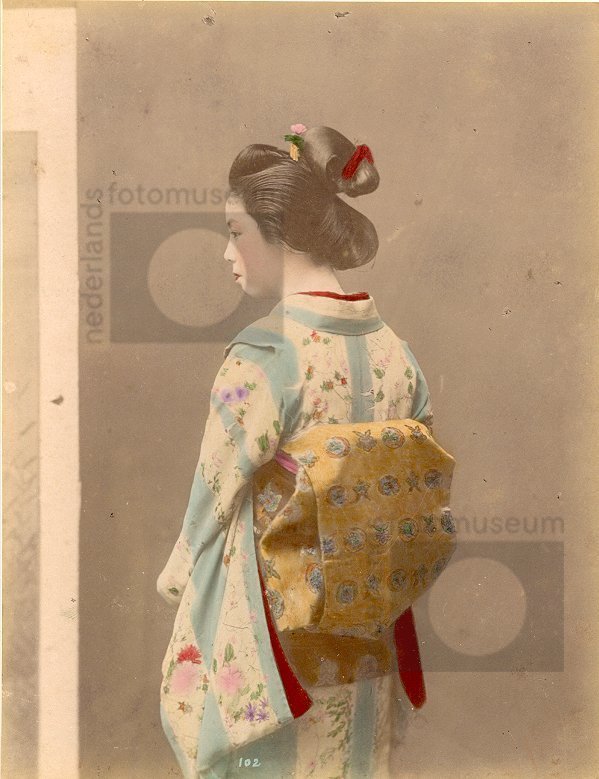 Studioportret van een vrouw in kimono, rugaanzicht, ...