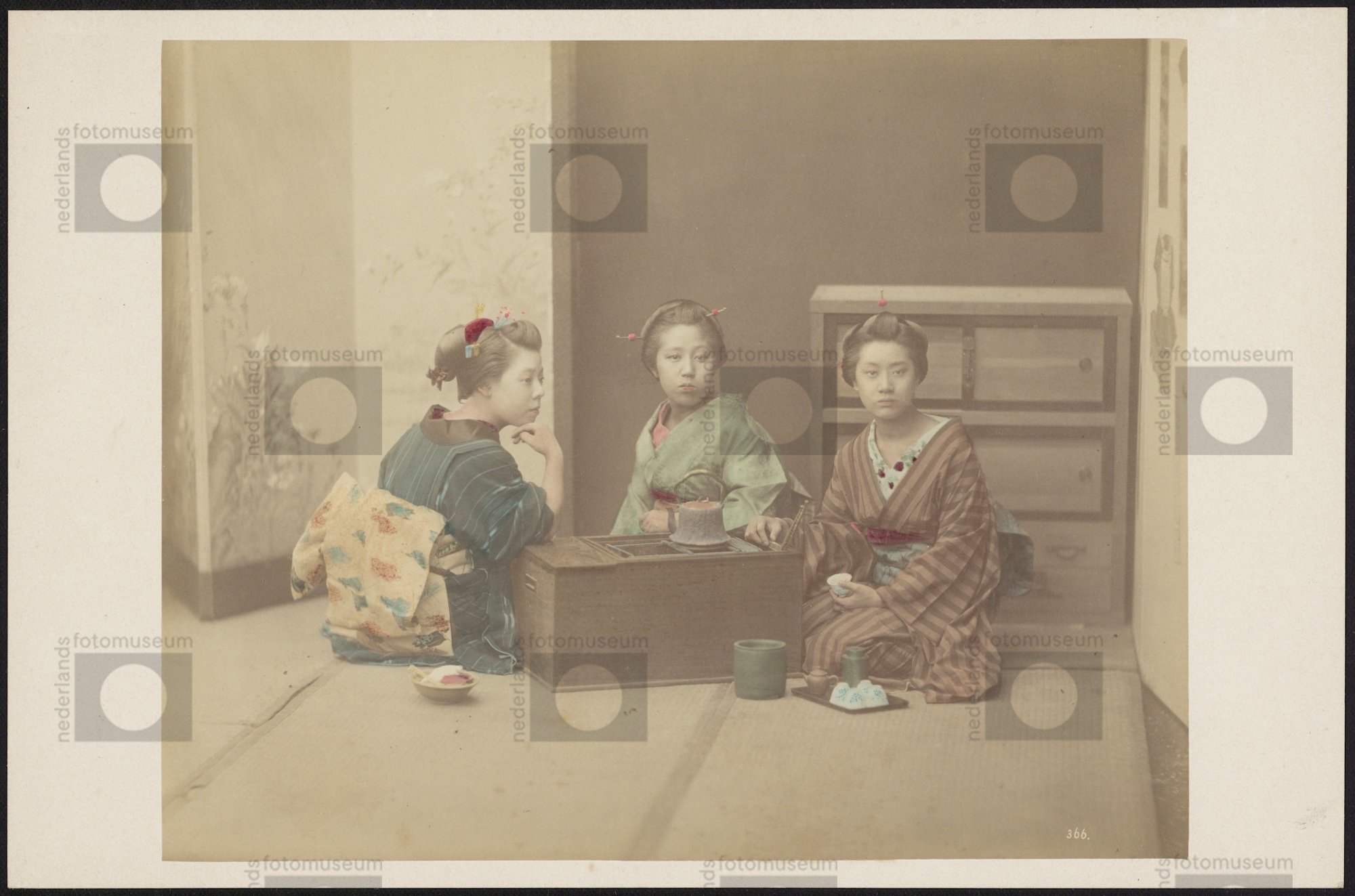 Drie-delige panoramafoto van danseressen, Kyoto, Jap...