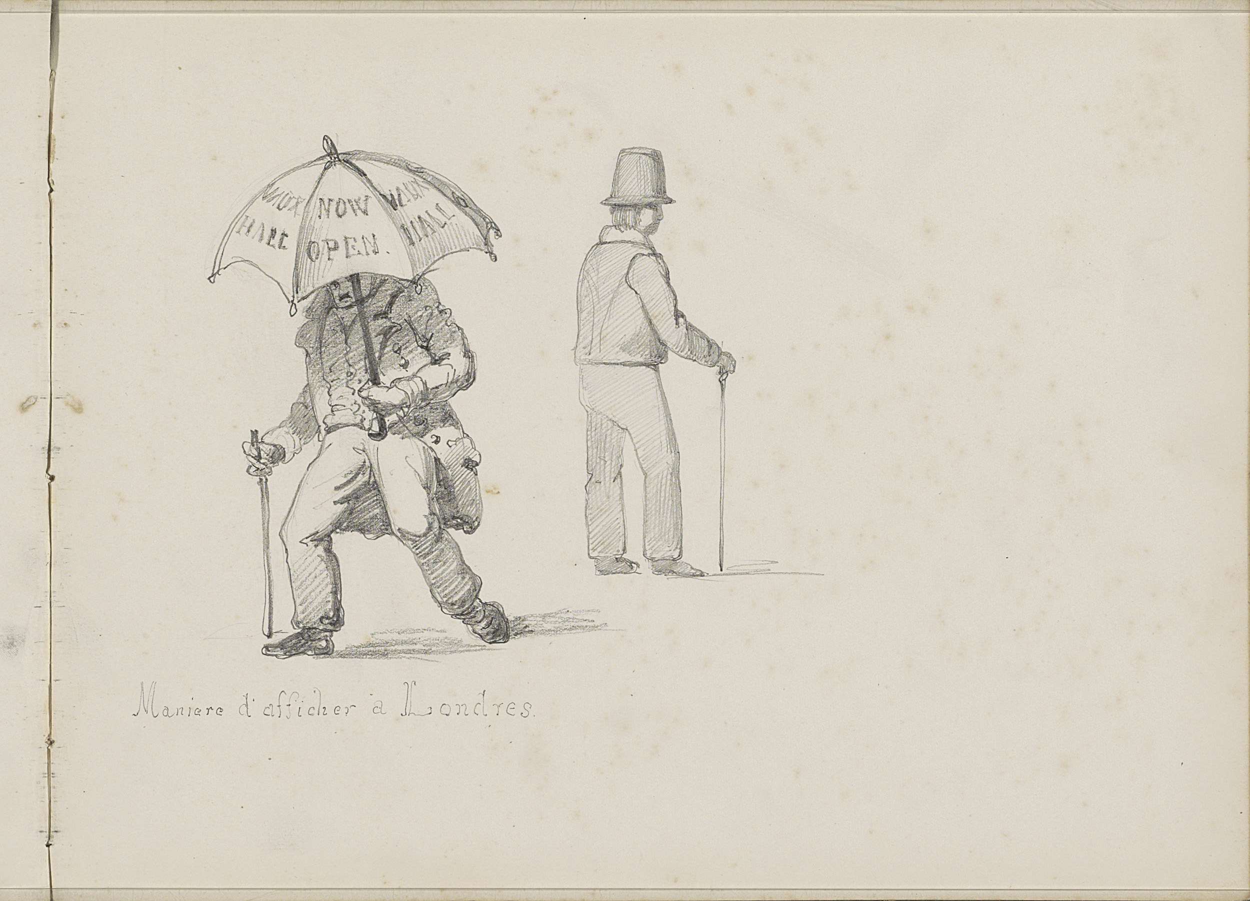 Man met paraplu met advertenties te Londen