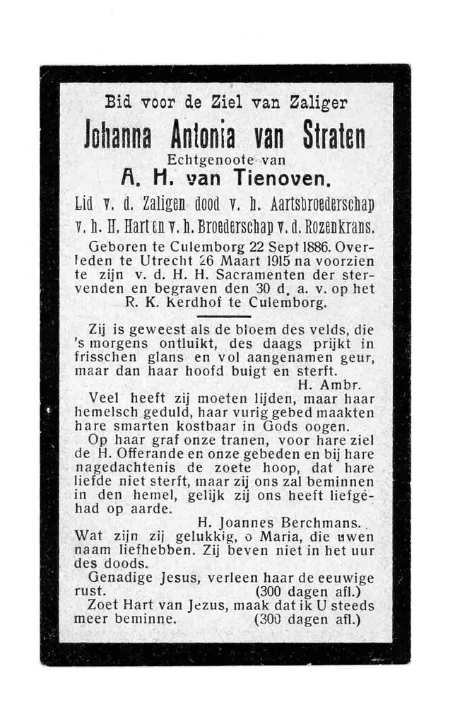 bidprent voor Johanna Antonia van Straten. Geboren 2...