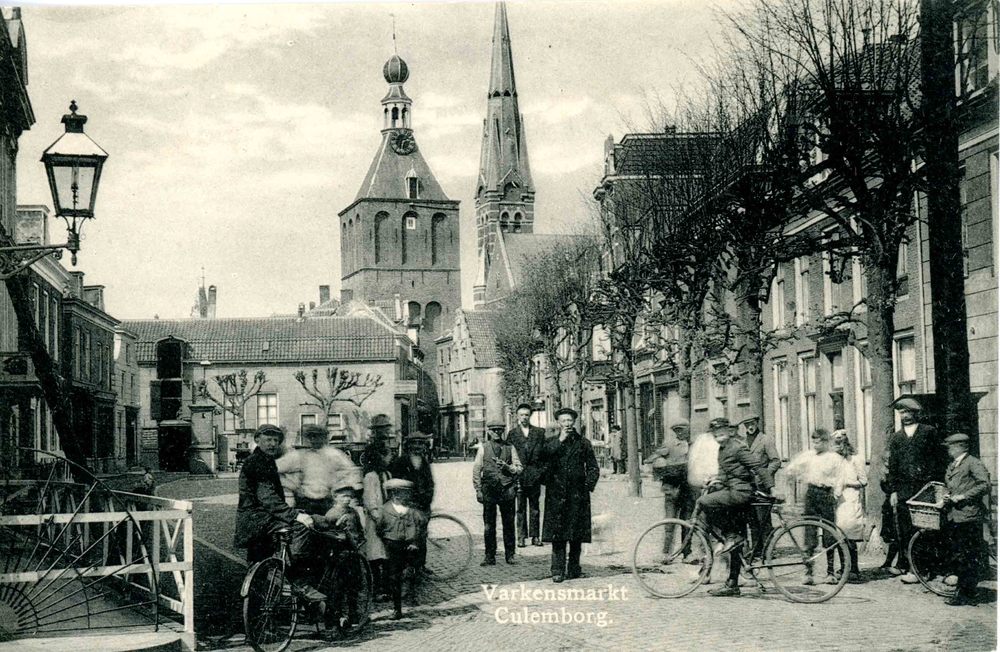 Ansichtkaart, voorstellende de Varkensmarkt te Culem...