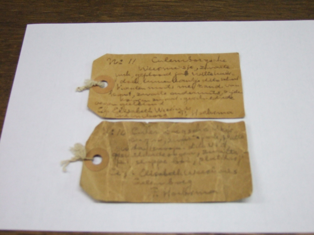 Etiket van bruin karton met handgeschreven beschrijv...