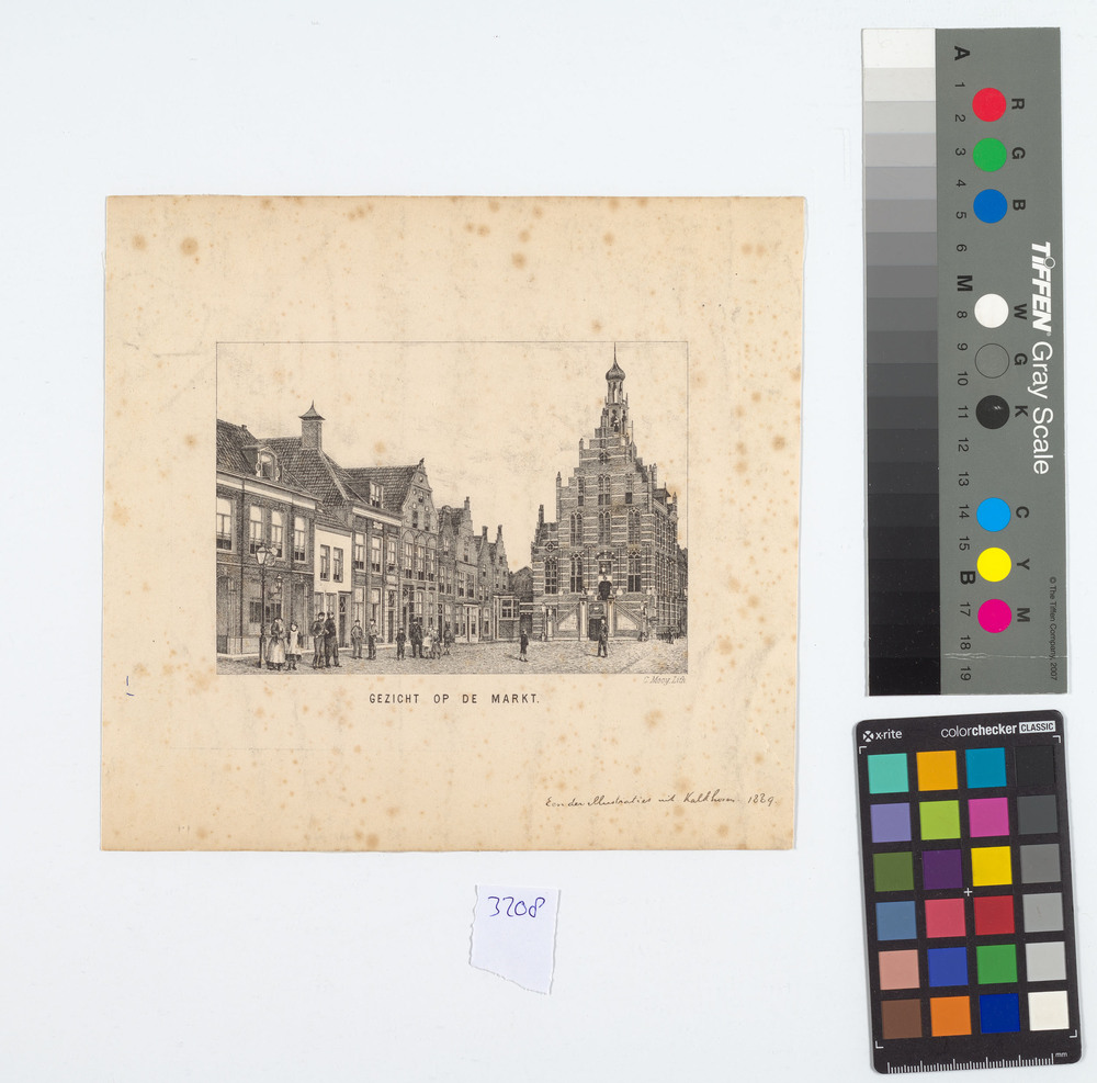 Prent voorstellende gezicht op de Markt met stadhuis...