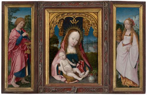 Drieluik met Maria met kind, Johannes de Evangelist ...