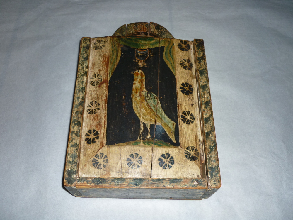 Schooltas in de vorm van een kist van hout met afsch...