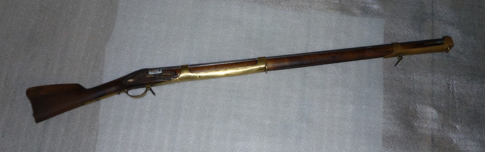 Geweer, zgn. vuursteenmusket, met bajonet, van hout,...