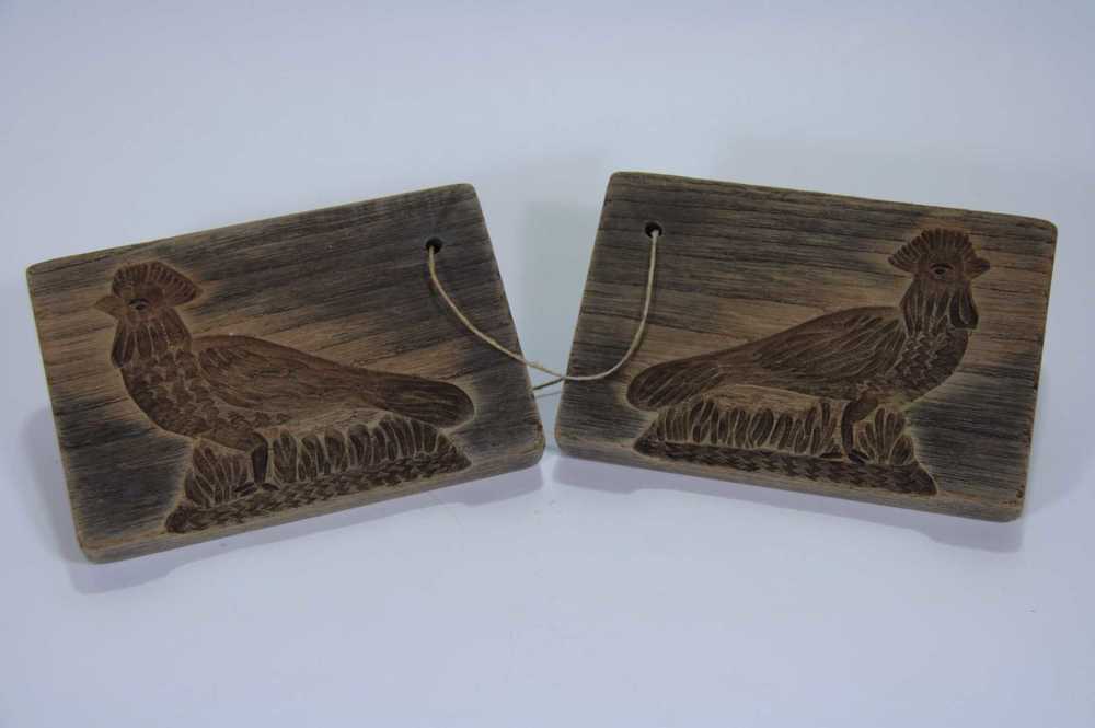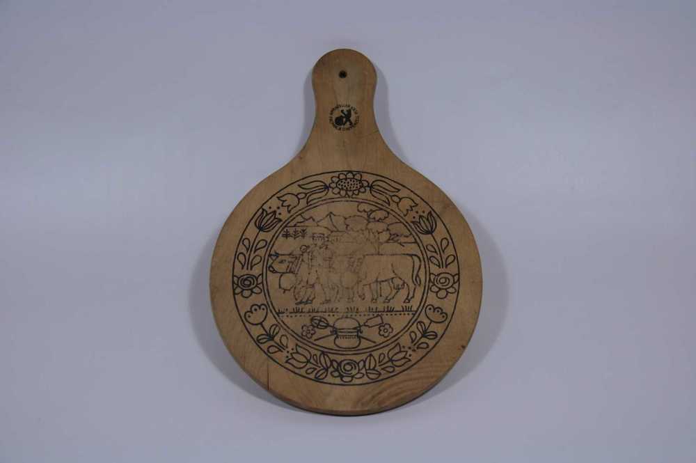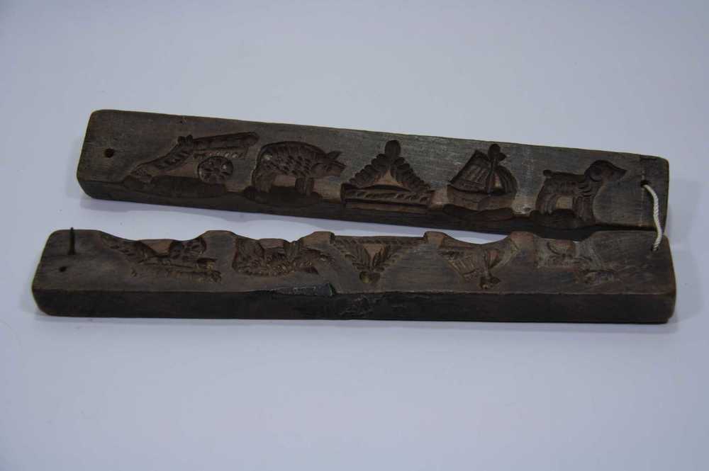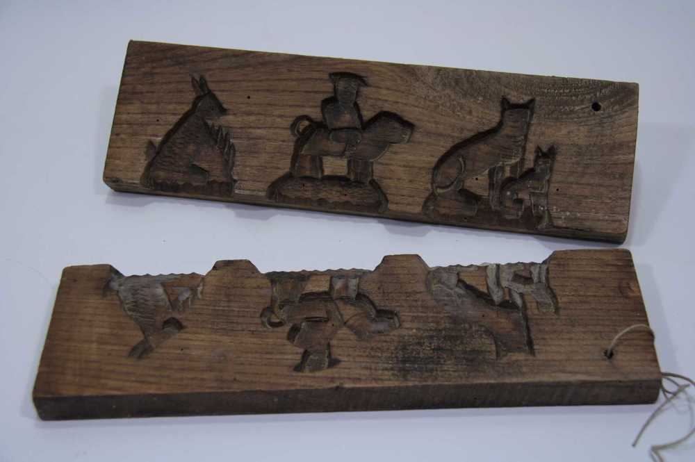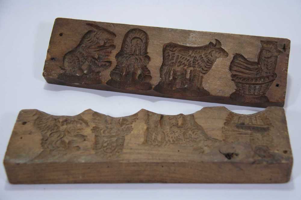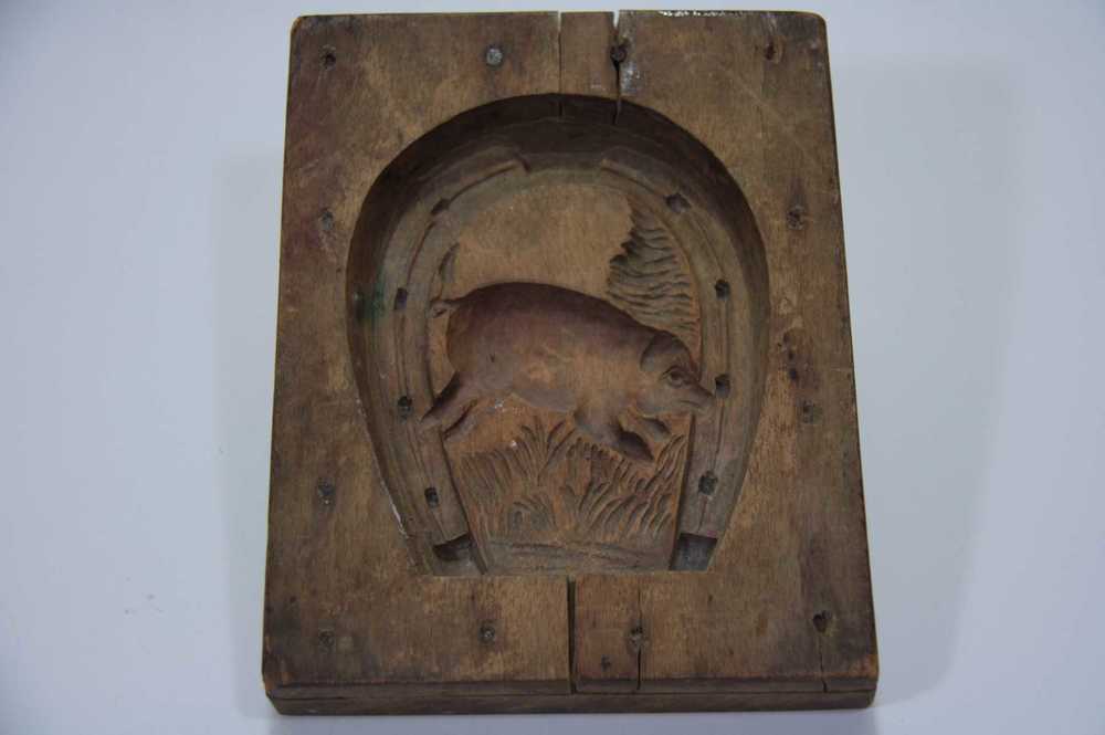 Suikerwerkplank van hout met 5 figuren, o.a. een hon...