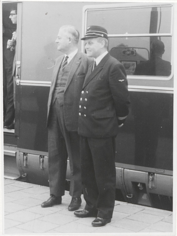 Rechts dhr. Jan Guikers, voor een trein, NS medewerk...