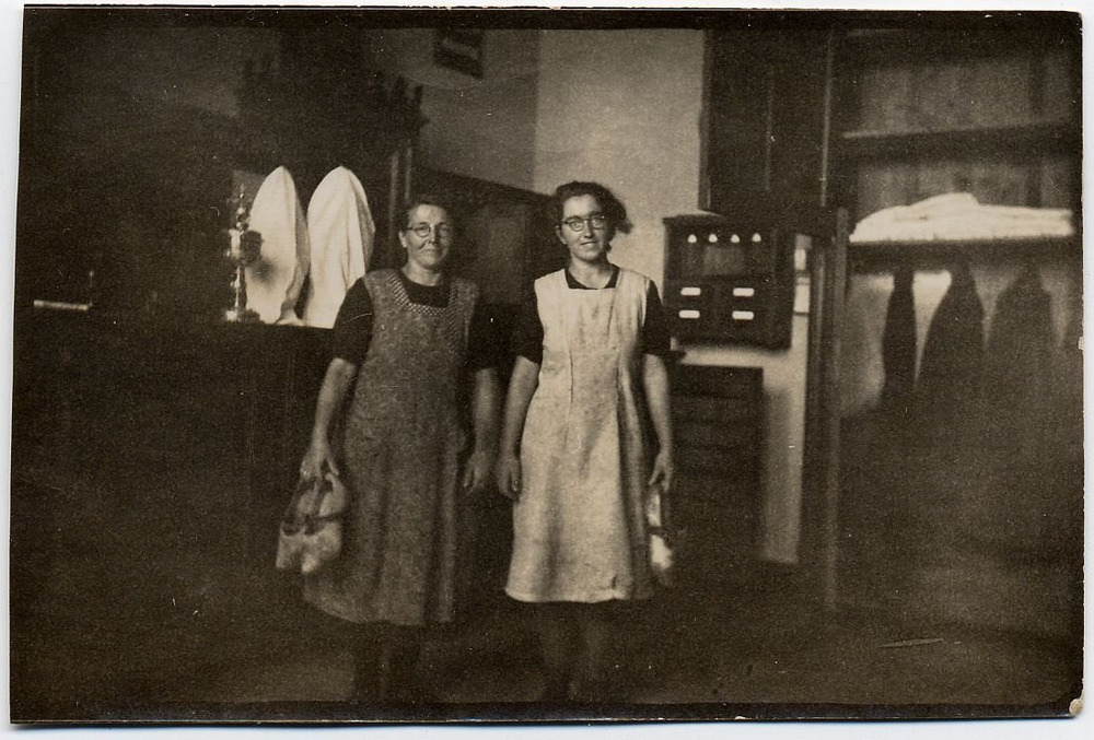 Twee schoonmaaksters van de kerk staande in de sacri...