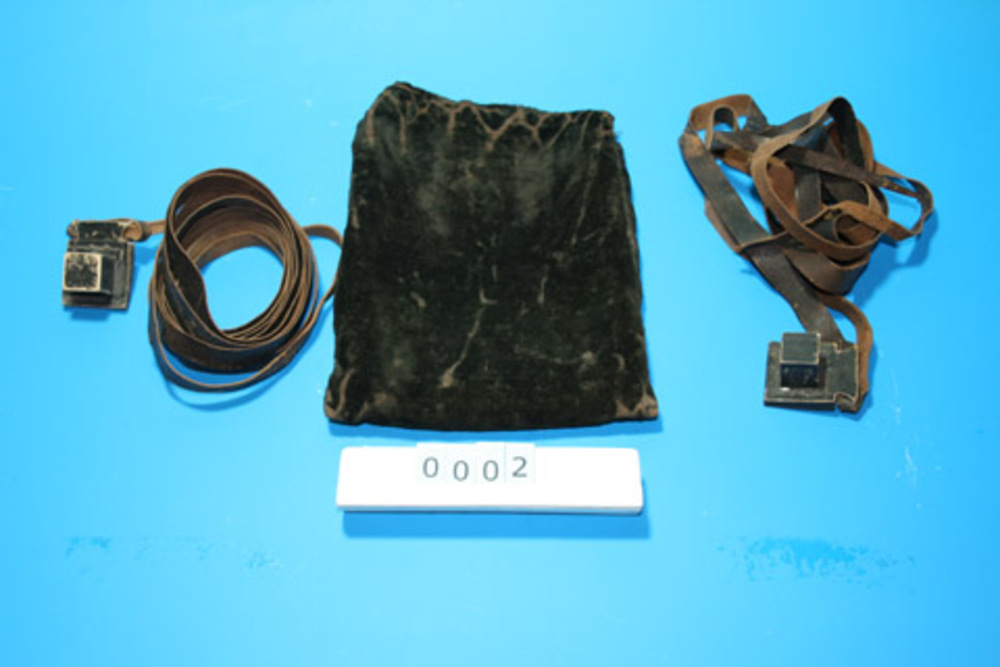 Twee gebedsriemen ( tefillien) met fluwelen zakje ui...