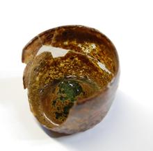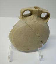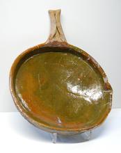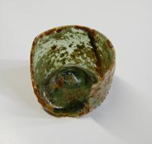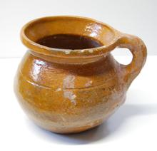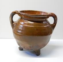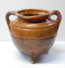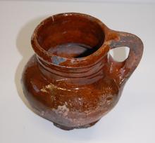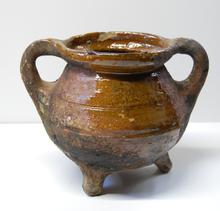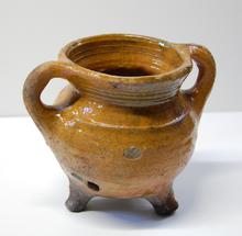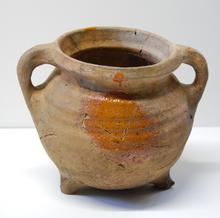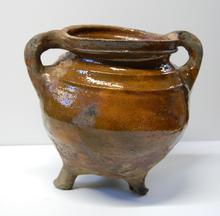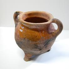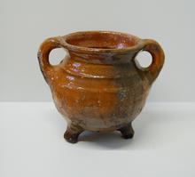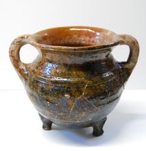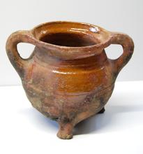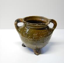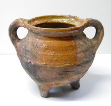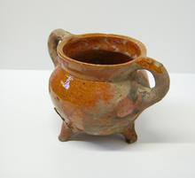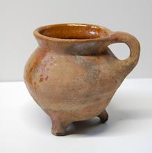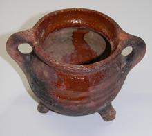 kan van rood aardewerk op drie pootjes, groen/bruin ...