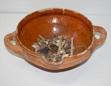 kom van rood aardewerk met inhoud (botjes)