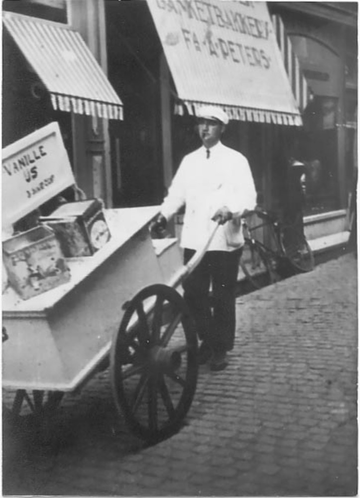 De heer Van Dalen, ijscoman met zijn ijskar in de Wa...