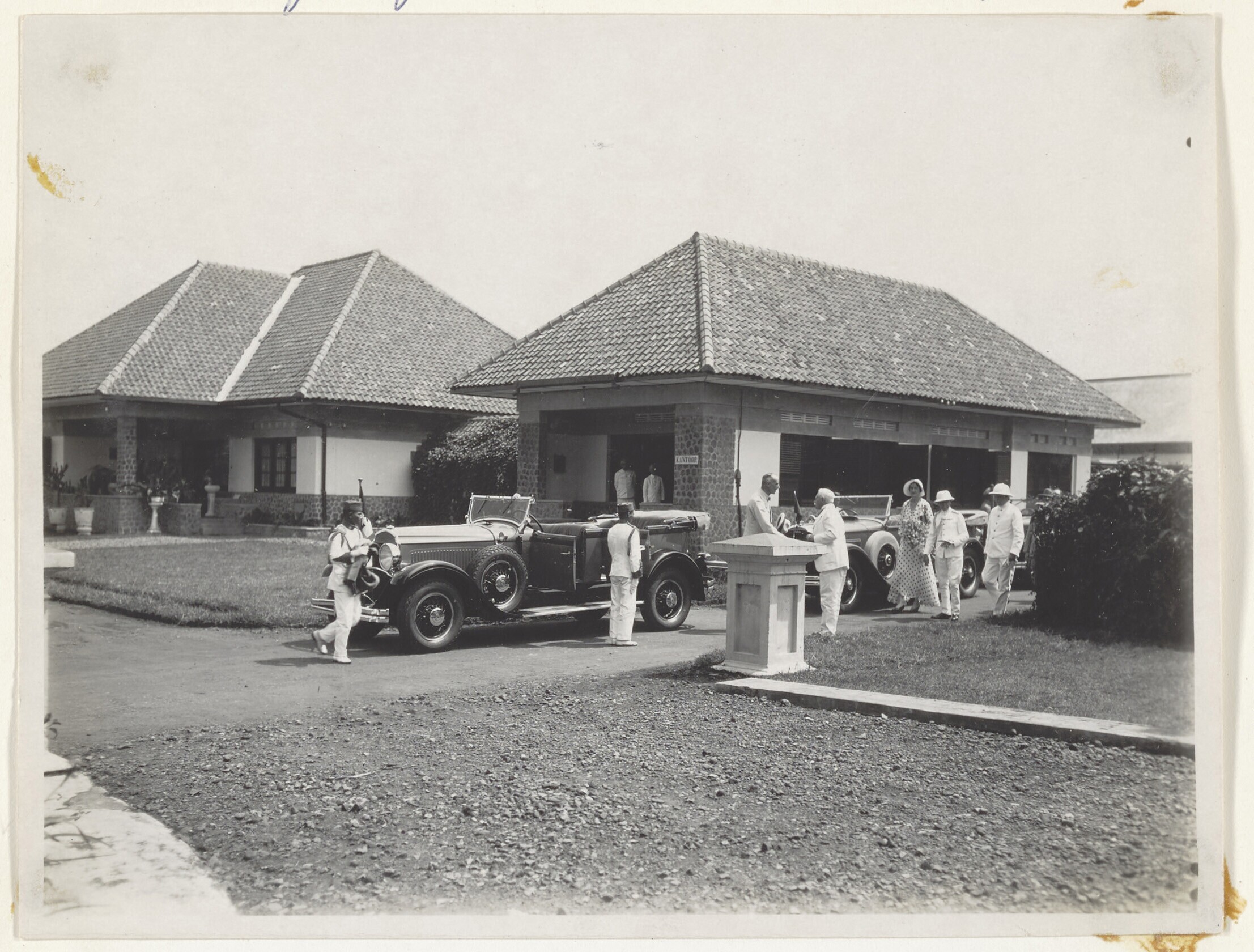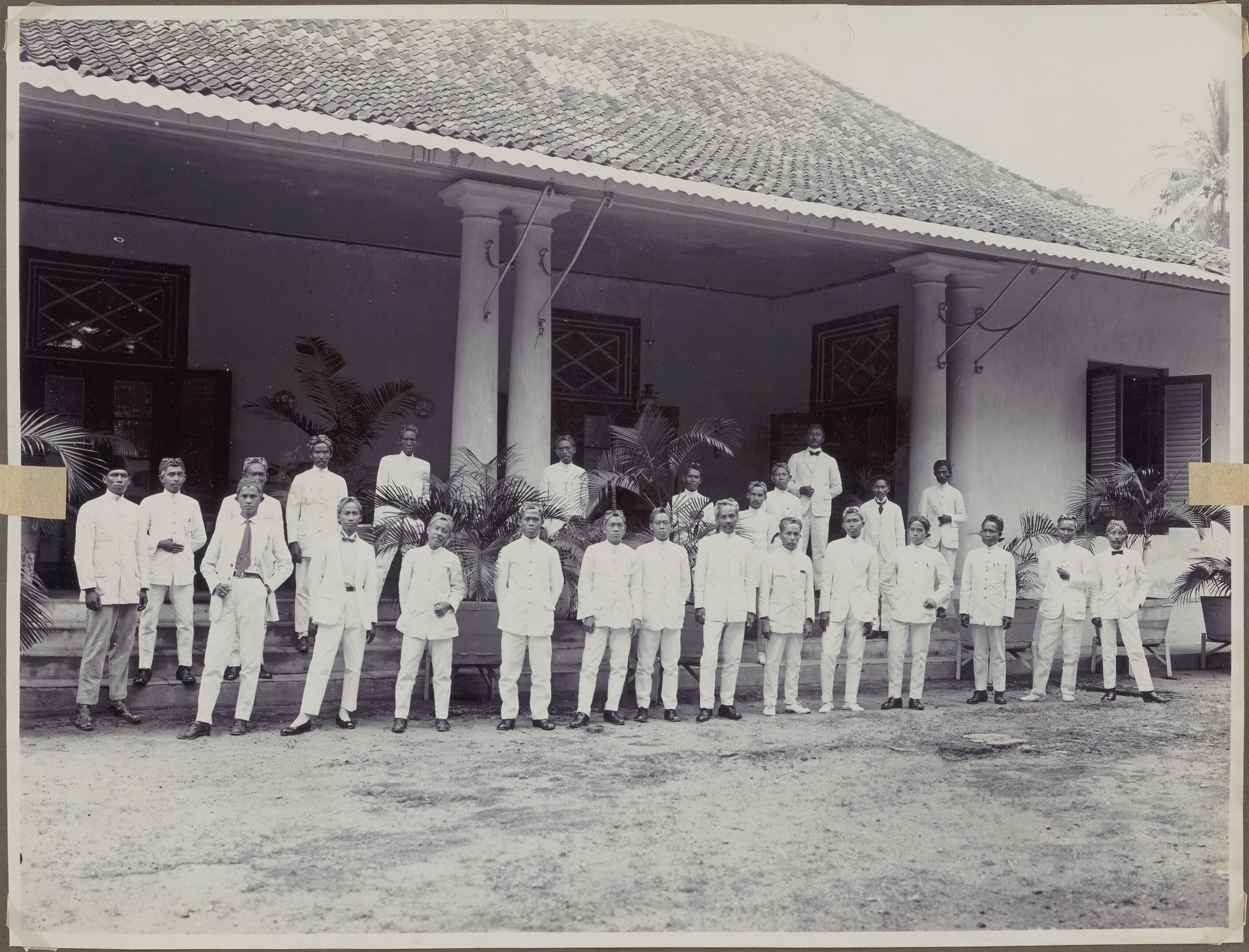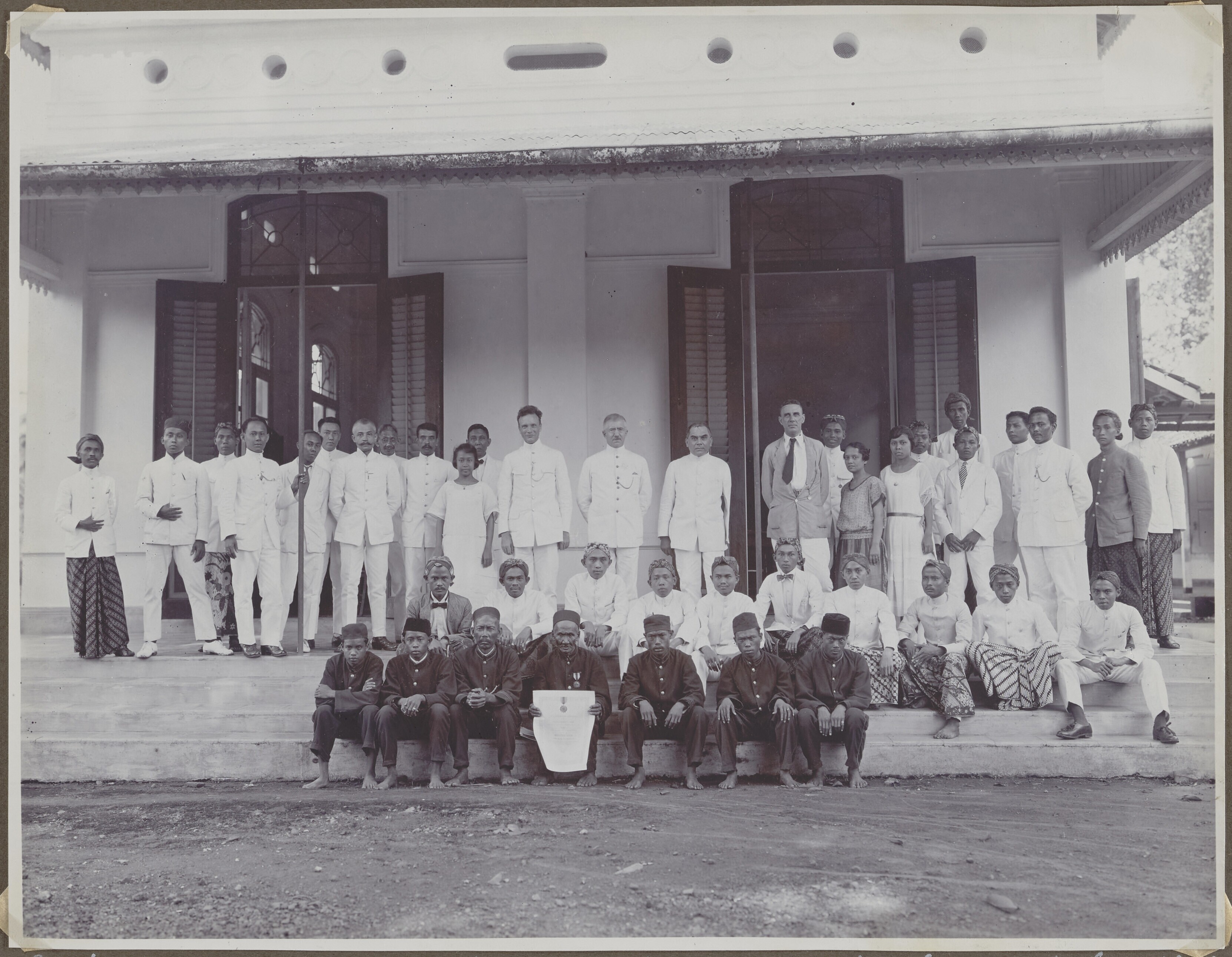 Europese en Javaanse mannen en vrouwen voor een gebouw