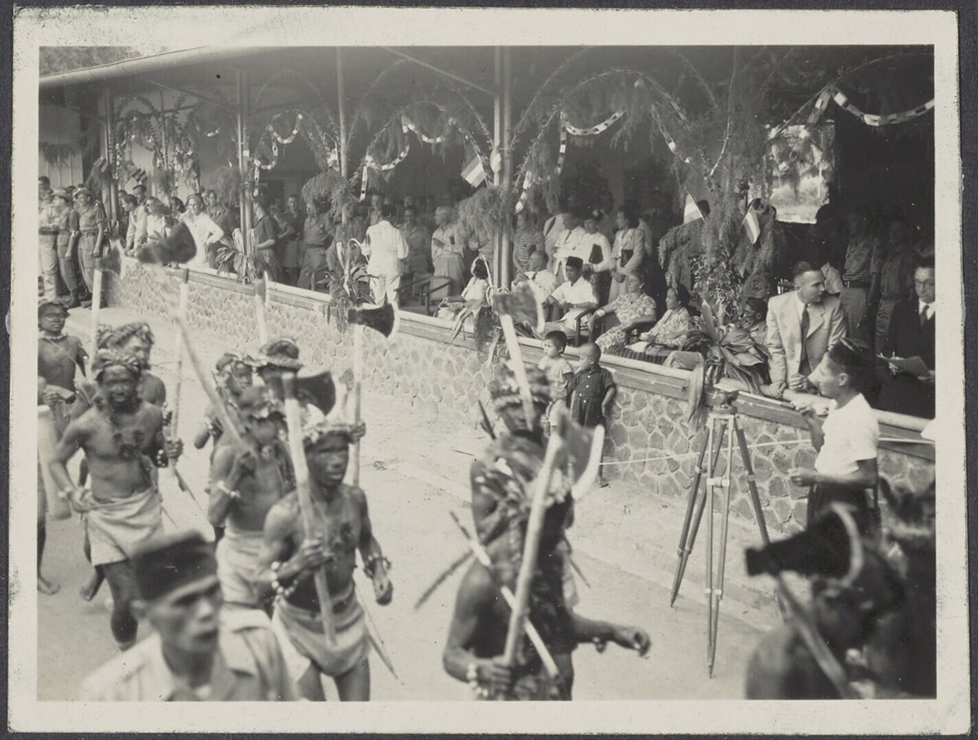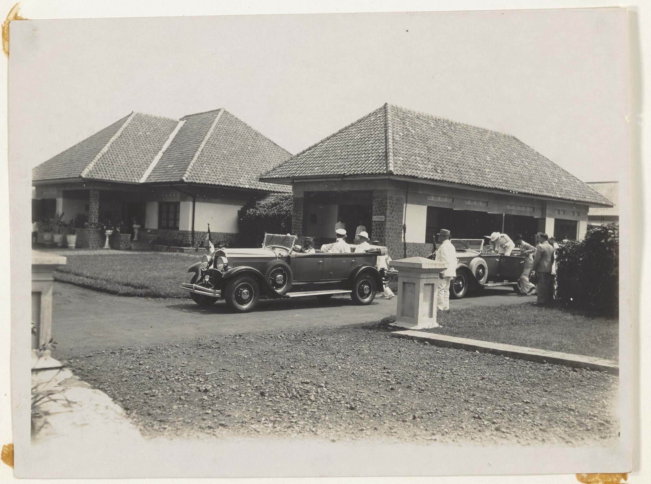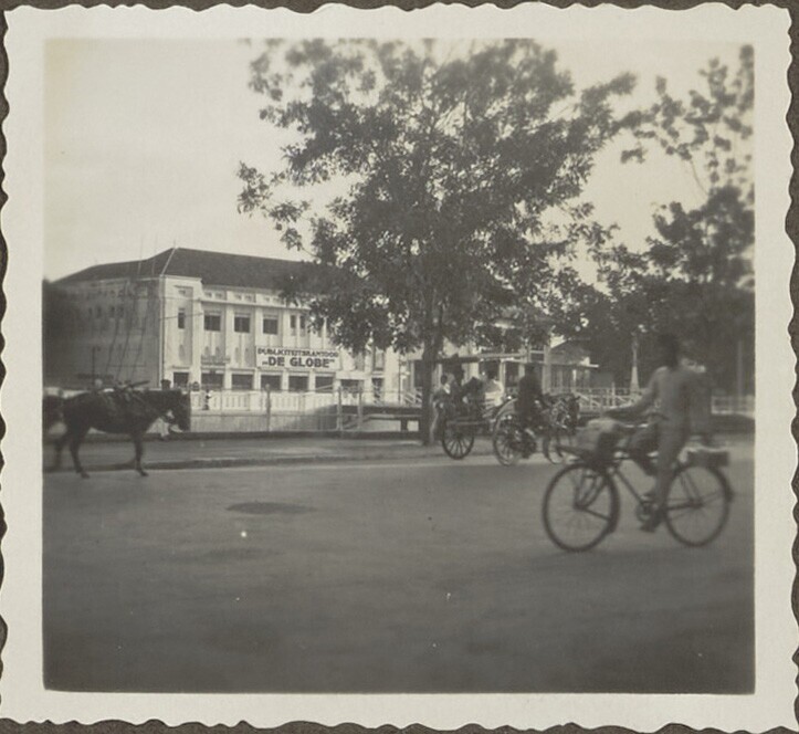 Europese en Javaanse mannen en vrouwen voor een gebouw