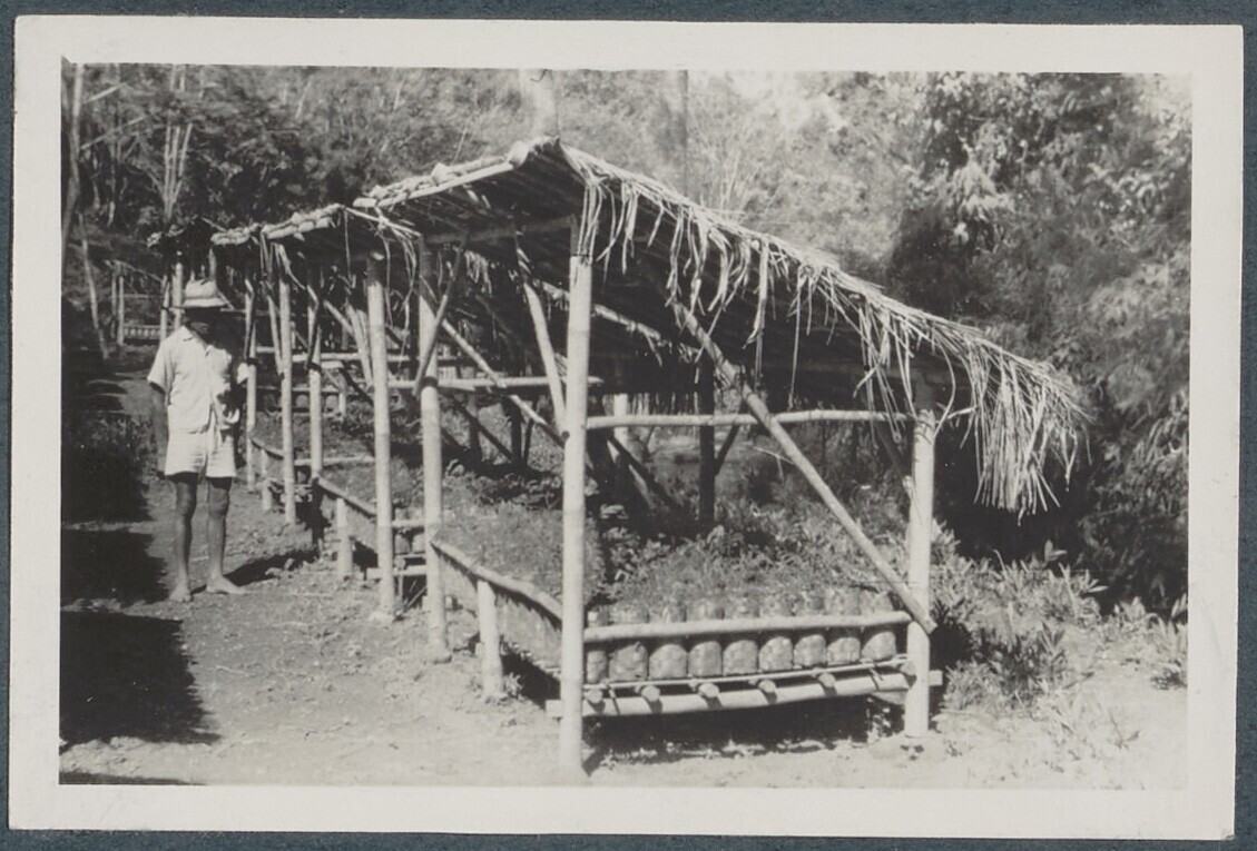 Arbeider staat naast een stellage van Albizzia-planten