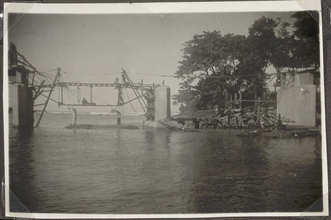 Bouwwerkzaamheden aan een brug door Javaaanse arbeiders