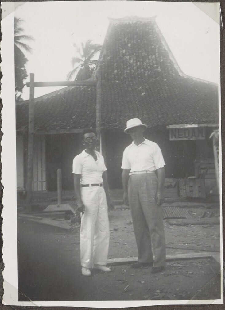 Europese en Javaanse man voor een gebouw