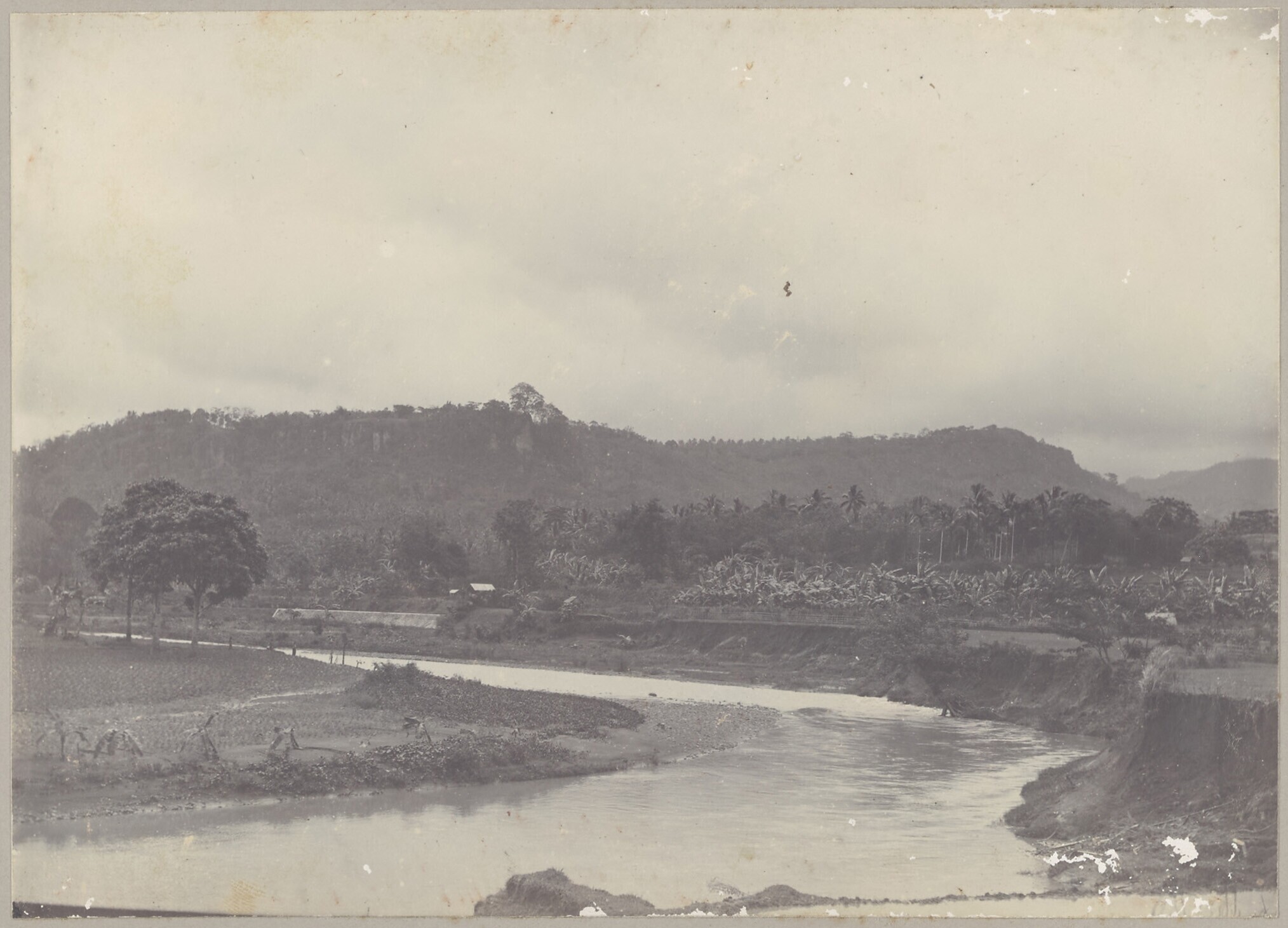 Meanderende rivier in de vallei bij bananen plantage