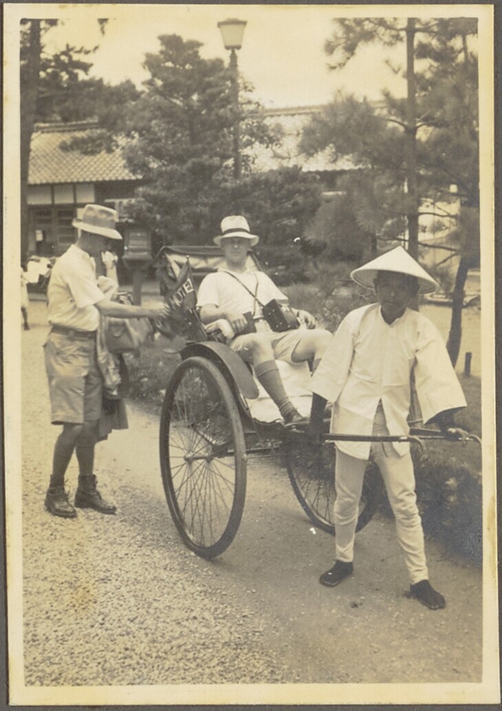 Europese mannen en Javaanse rikshaw trekker / drager
