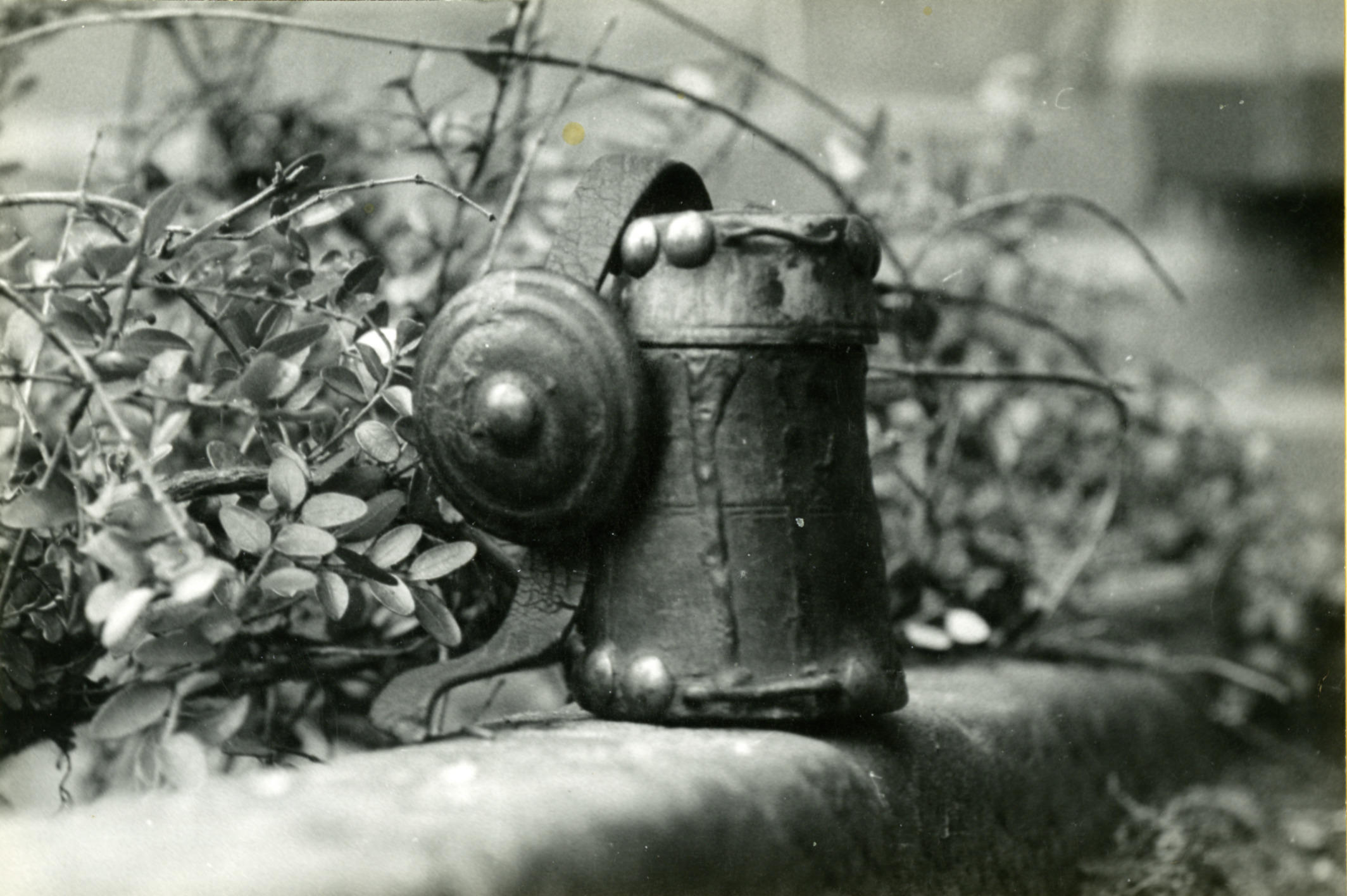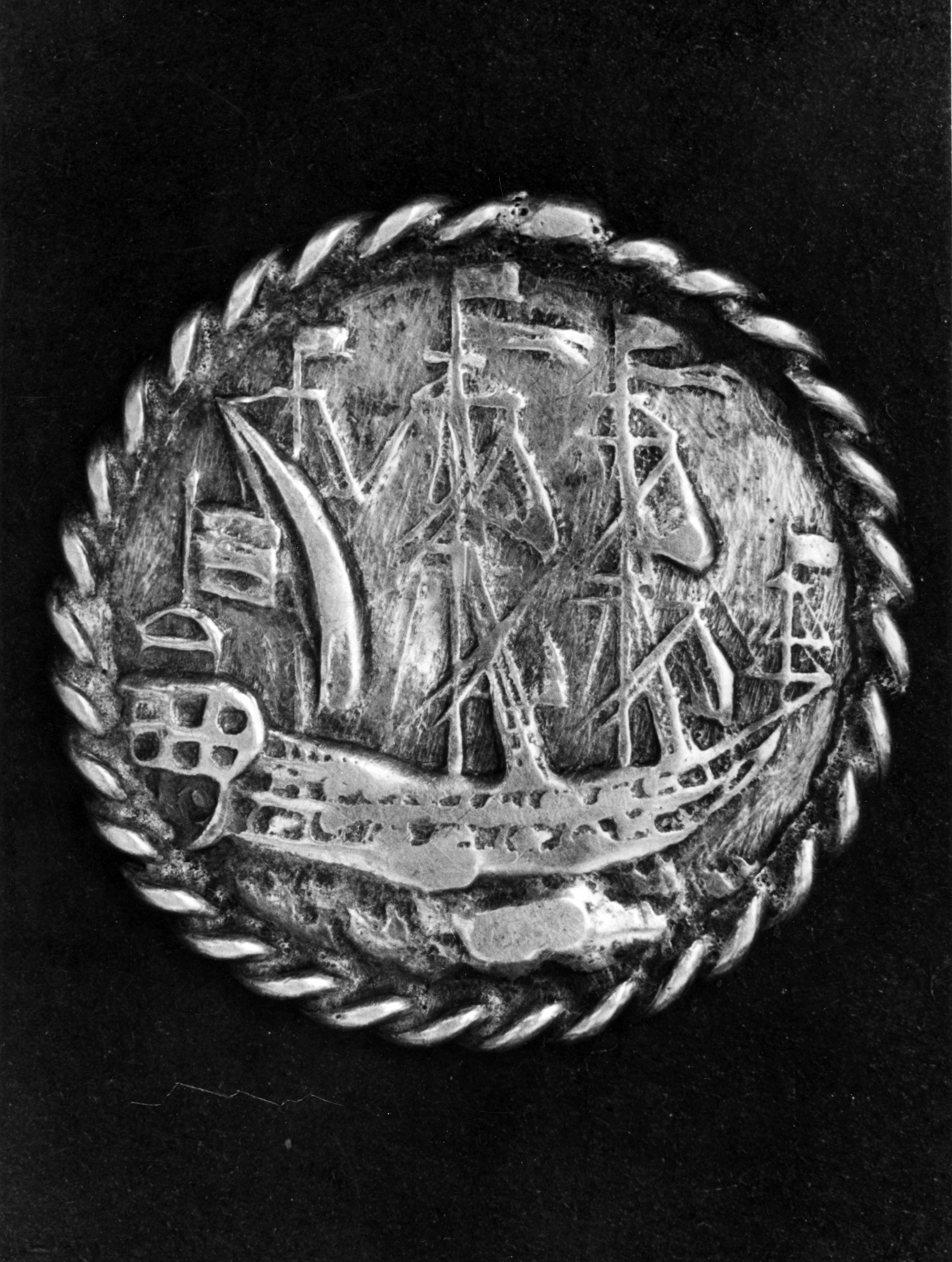 Zilveren knoop met schip, Marken, 1943 (zwart-wit foto)