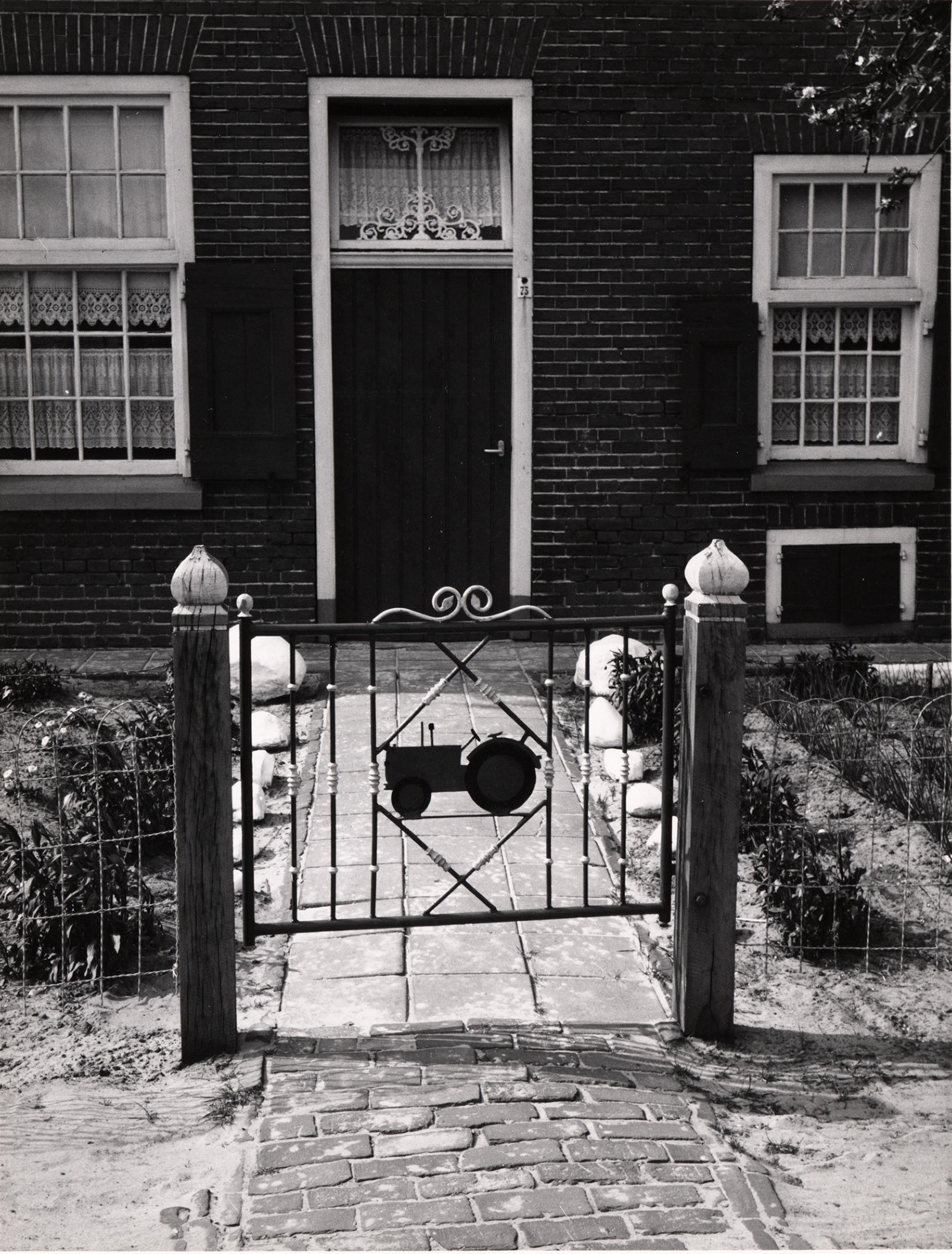 Tuinhekje met tractor, Staphorst, 1959 (zwart-wit foto)