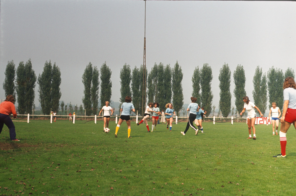 Kleurendia van een damesvoetbalwedstrijd uit een dia...