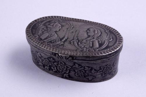 Ovale tinnen doos met portretten van Willem V en Wil...