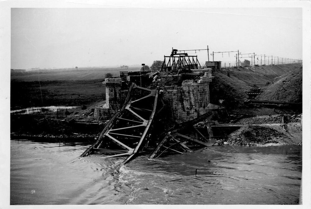 Verwoeste spoorbruggen bij Zaltbommel