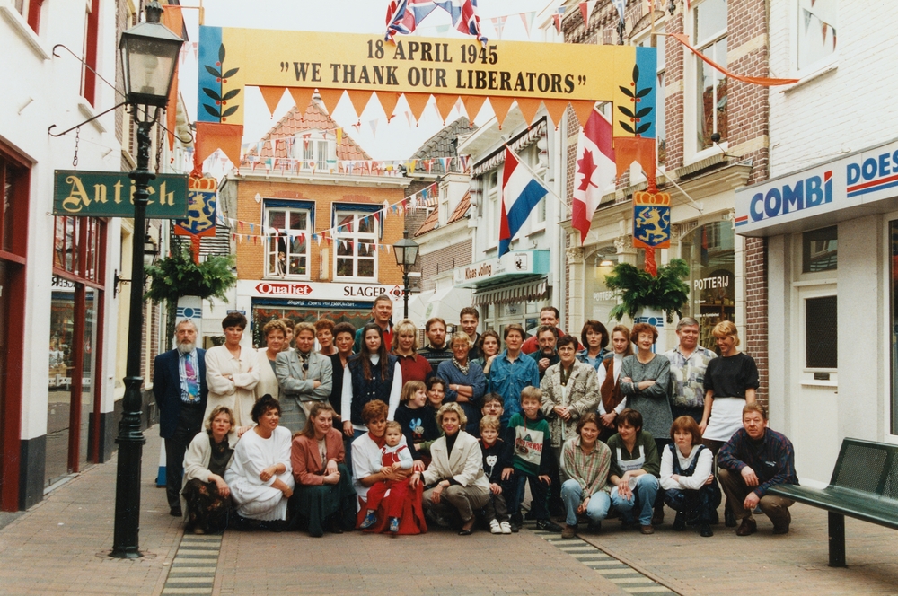 Ondernemers uit de Hondegatstraat poseren bij ereboog