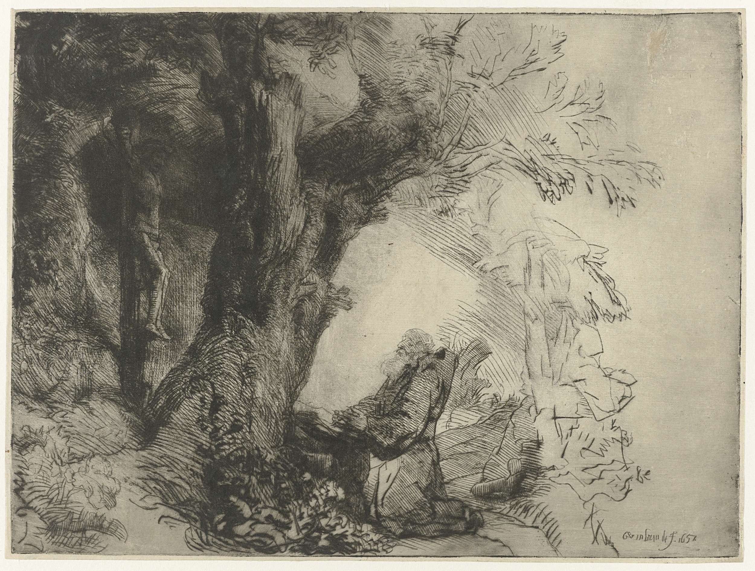 Franciscus knielend in gebed onder een boom