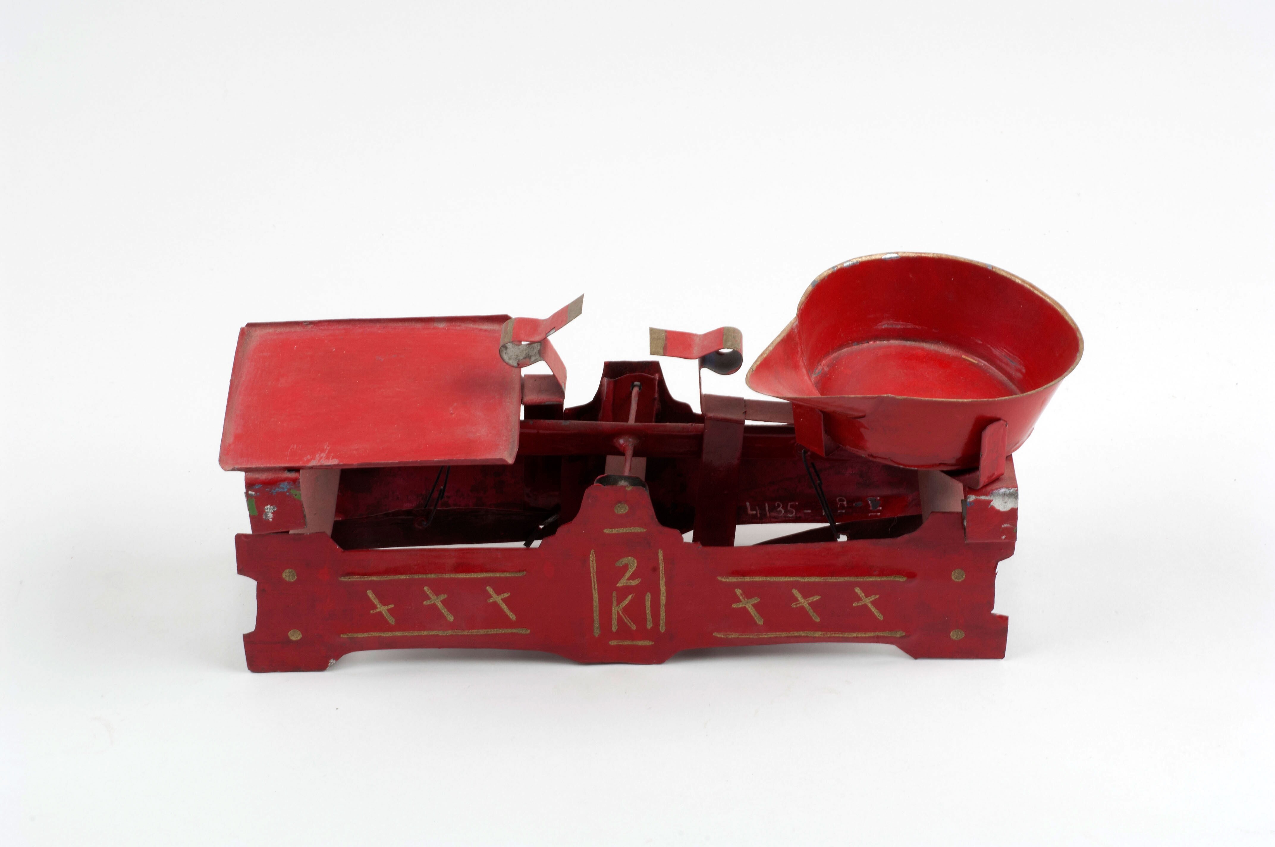Speelgoedweegschaal met schaal en drie tinnen gewichten