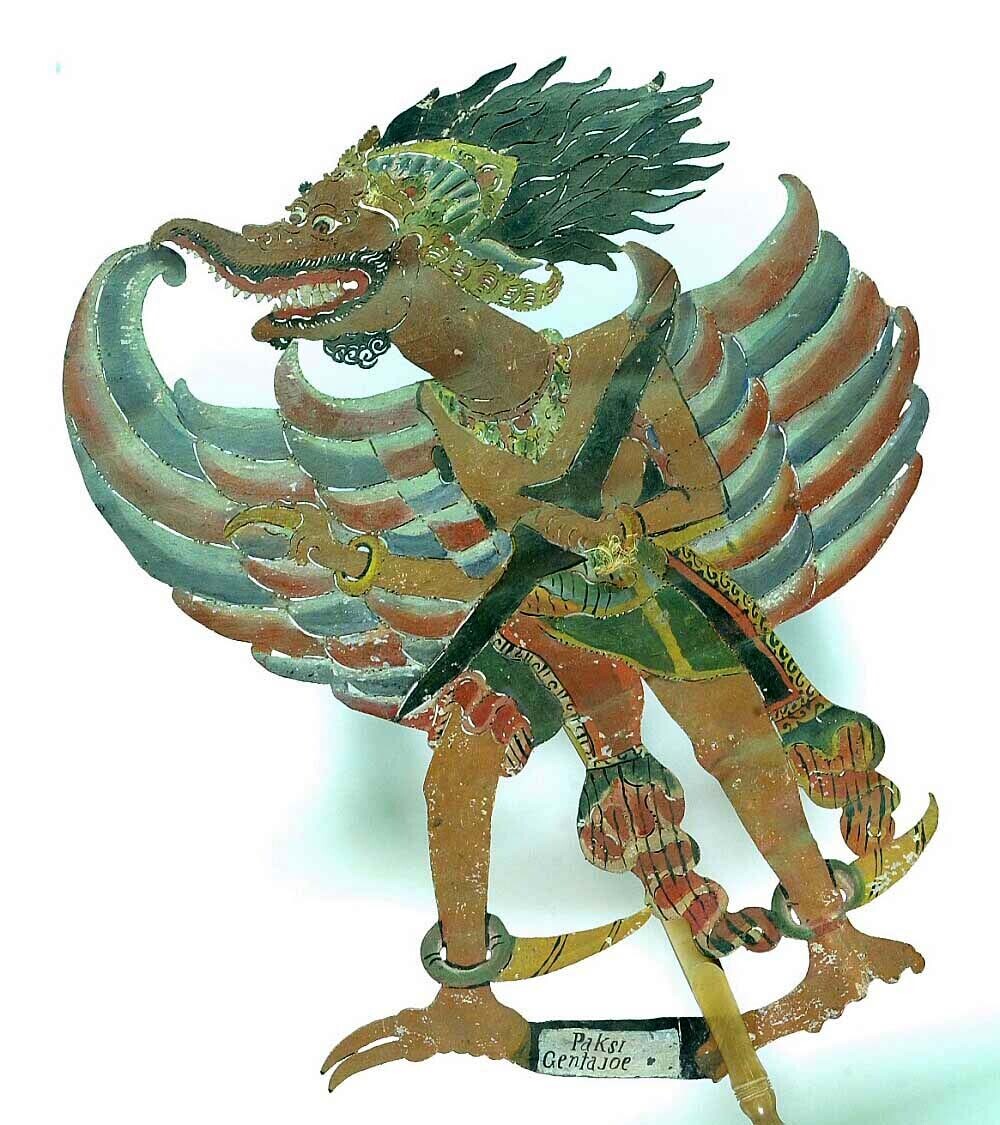 Wajangfiguur van leer voorstellende Paksi Gentayu, e...