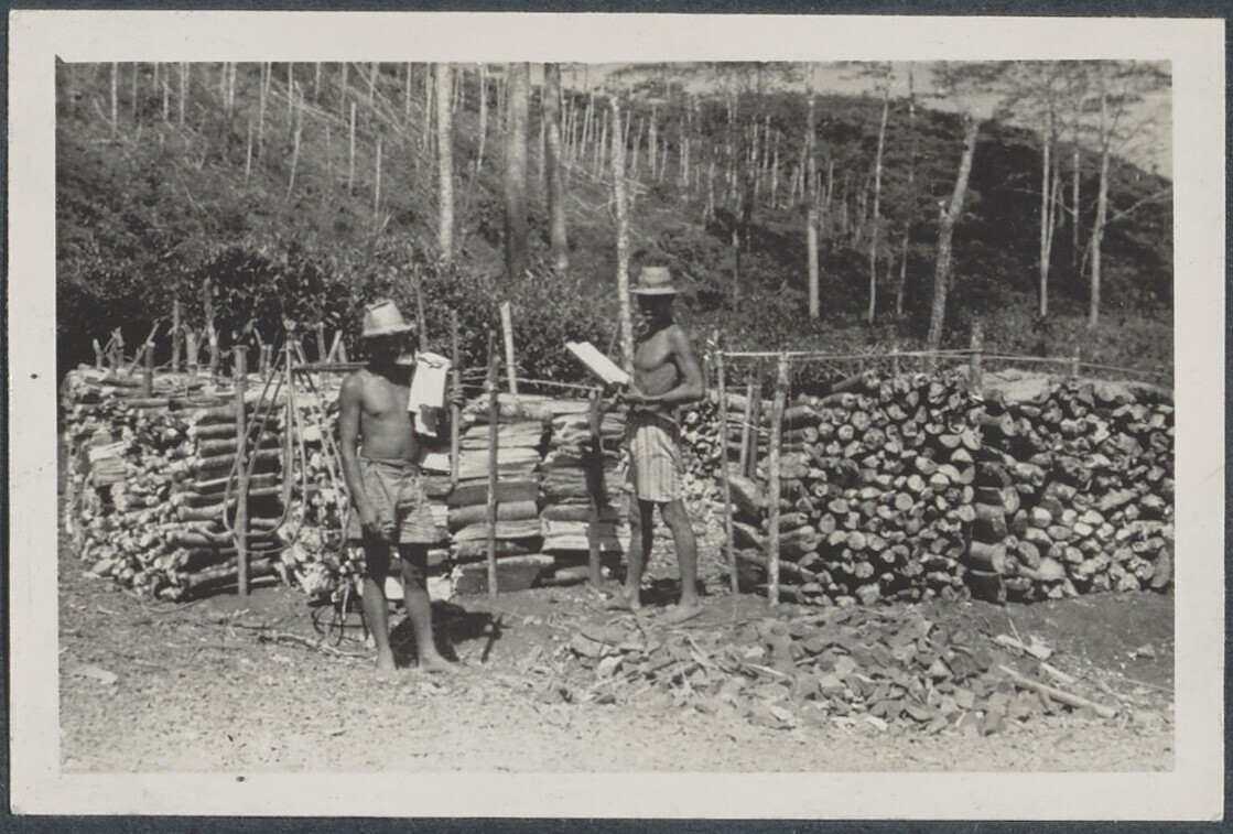 Javaanse mannen en vrouwen sjouwen bundels hout over...