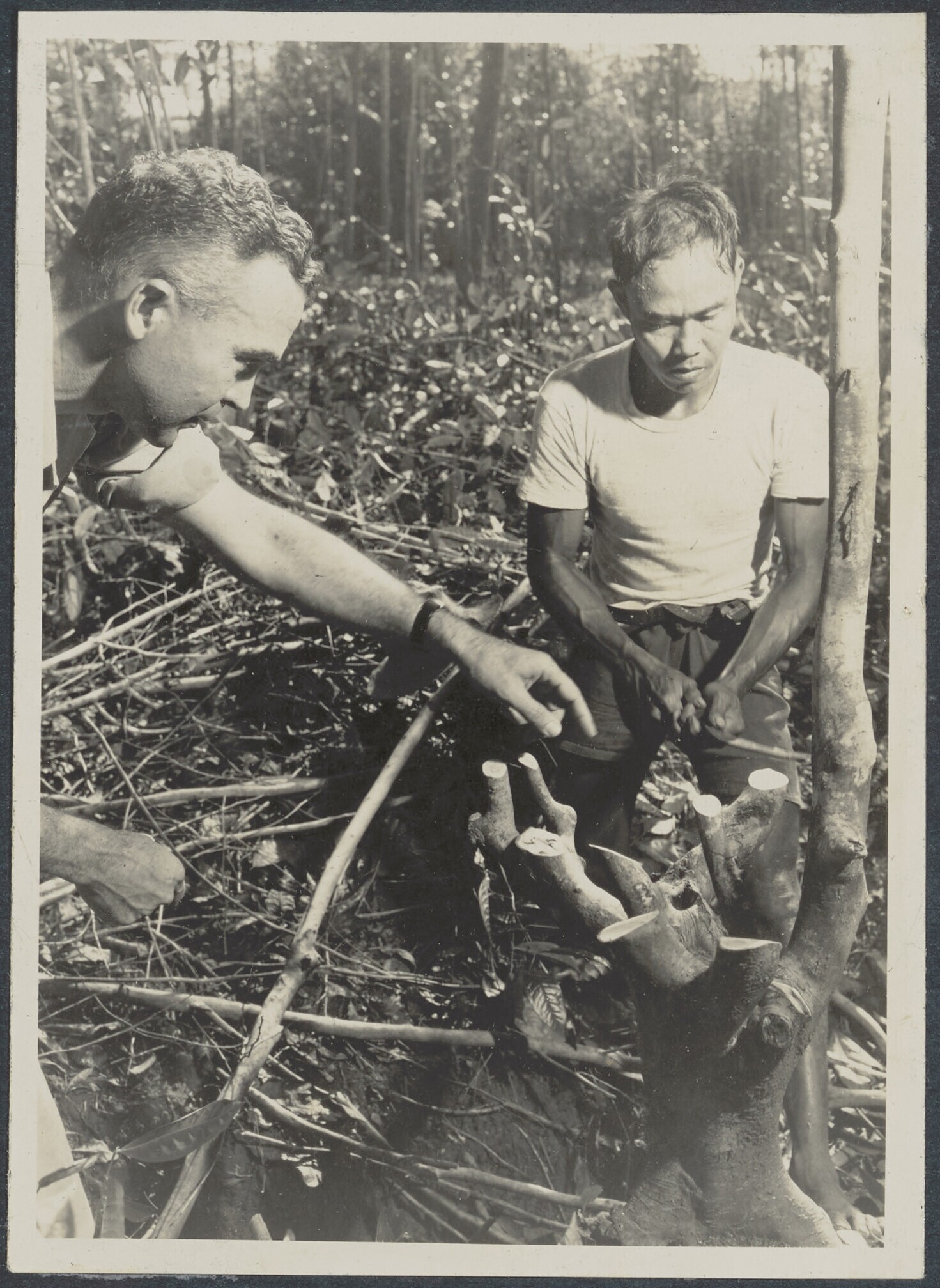 Europese man met mesje en Javaanse landarbeider in p...