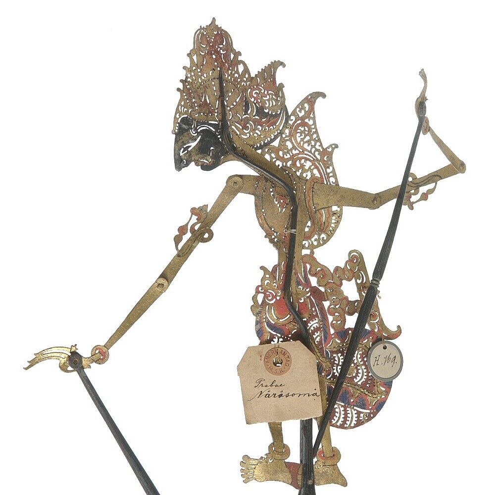 Gesnlen en beschilderd beeld van een wajangfiguur