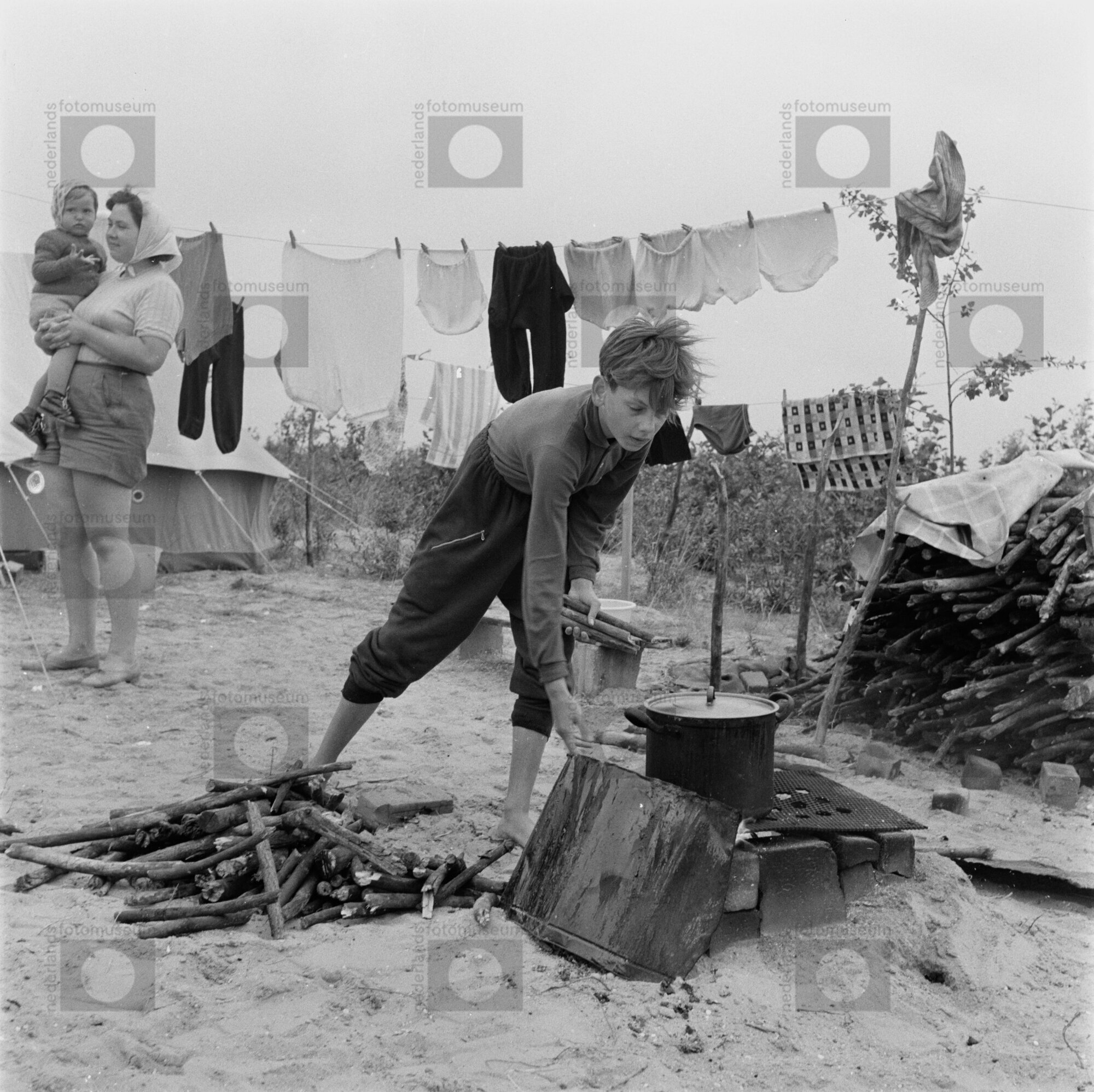 Kamperen aan het Veluwemeer. Jongen verzamelt takken...