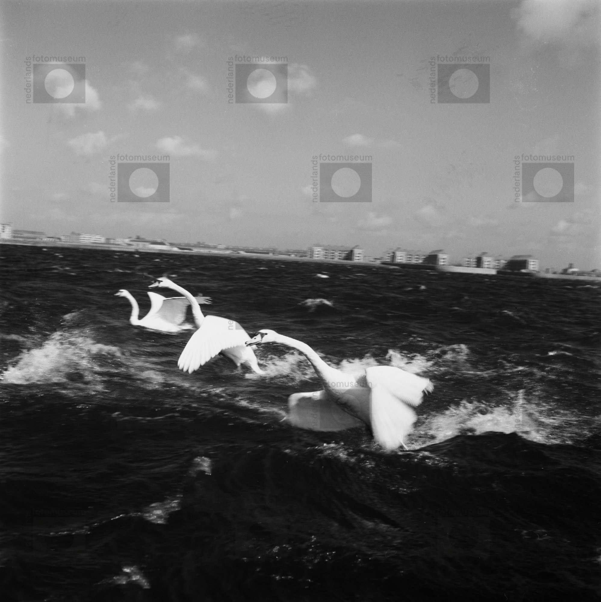 Amsterdam, Sloterplas. Zwanen gaan op de vleugels vl...