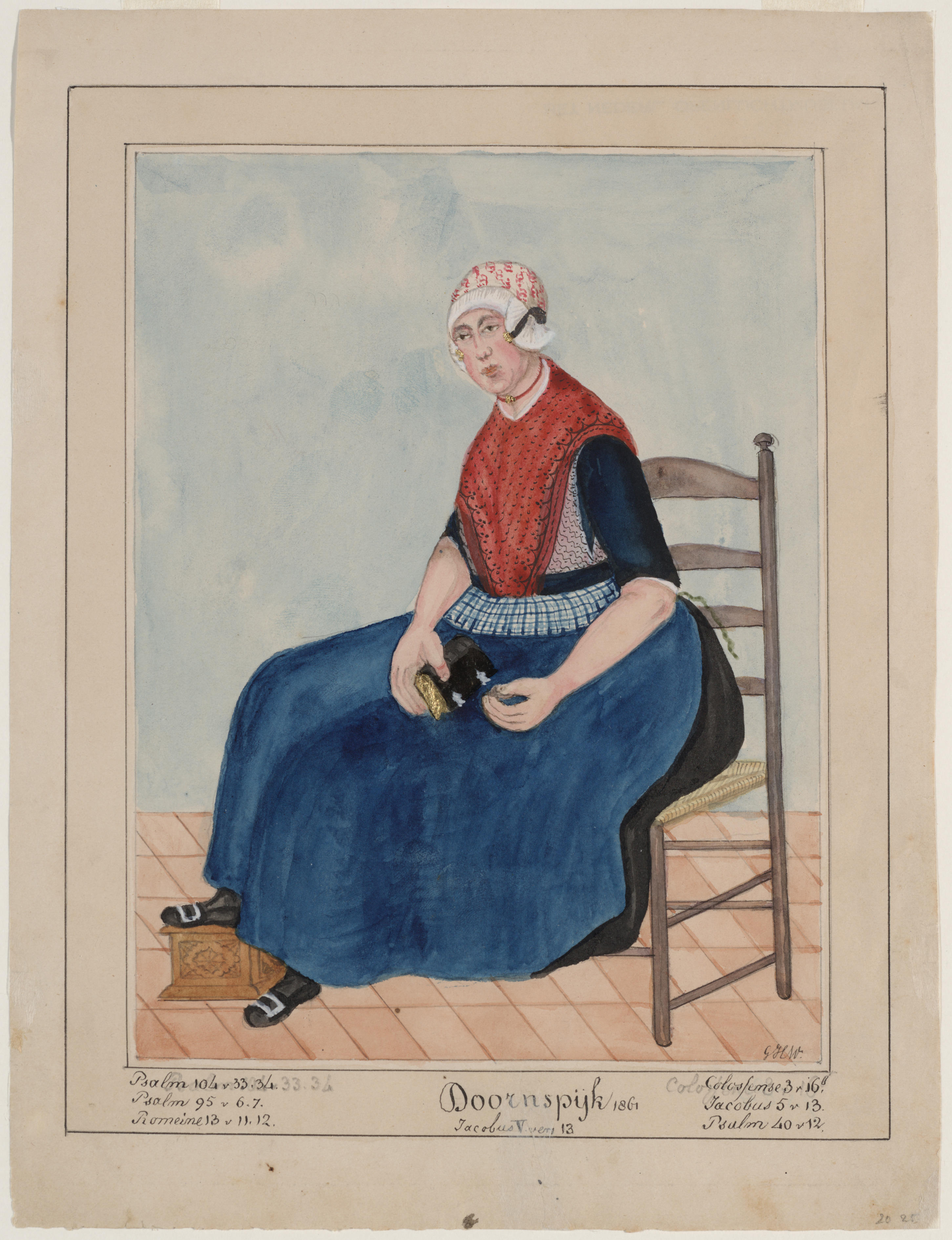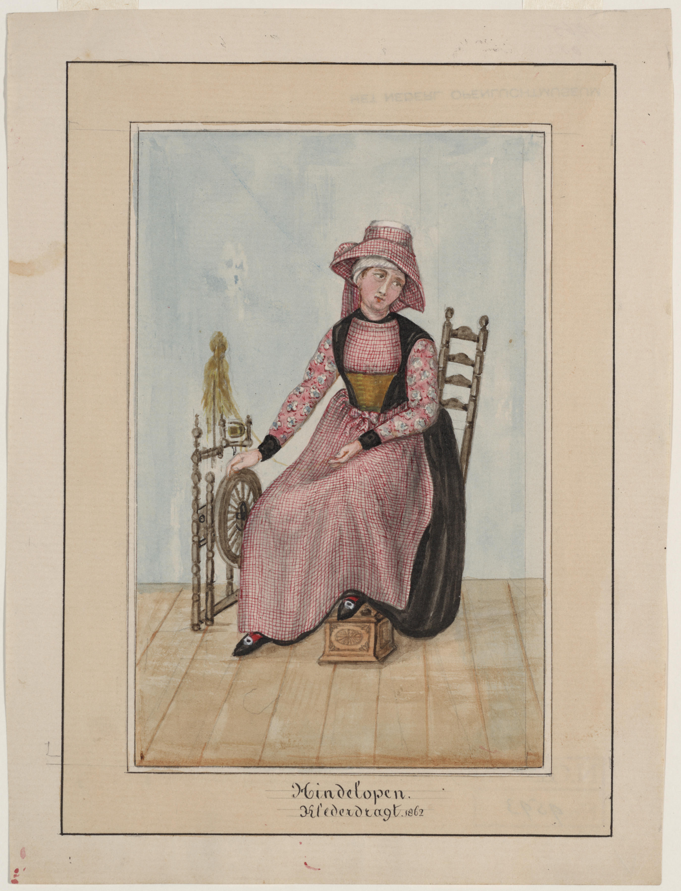 Vrouw in dracht aan een spinnewiel, Hindeloopen, 1862