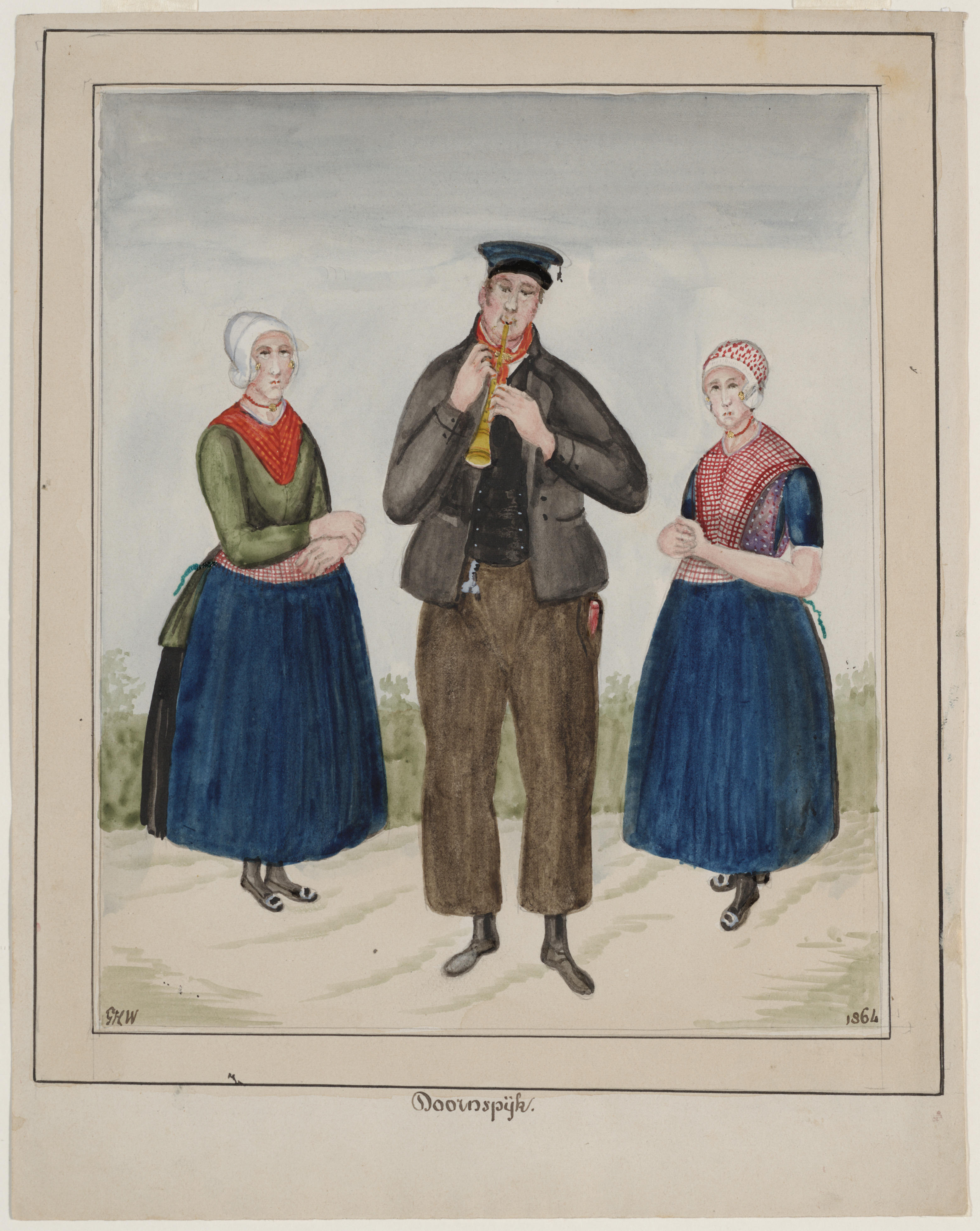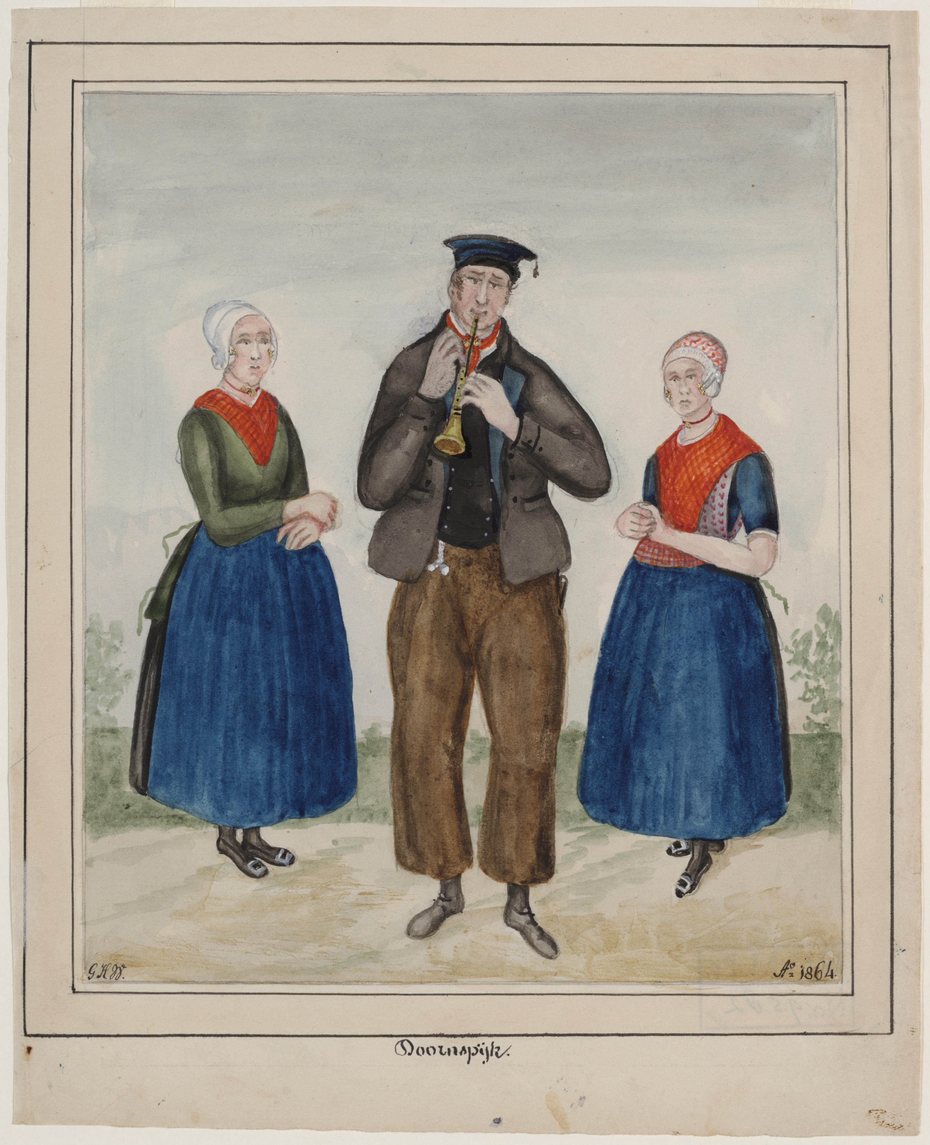 Fluitspelende man en twee vrouwen in dracht, Doornsp...