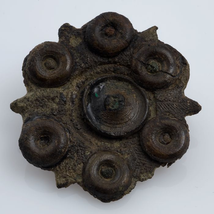 Bronzen fibula of mantelspeld, versierde schijffibul...