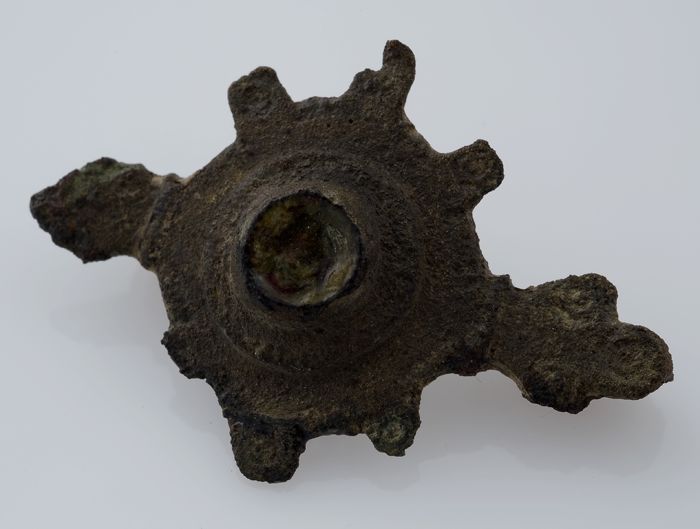 Bronzen fibula of mantelspeld in de vorm van getande...