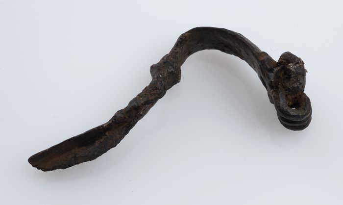 Bronzen fibula of mantelspeld, smal gebogen model