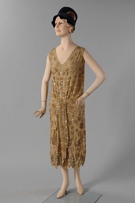 Knielange rechte, mouwloze beige japon versierd met ...