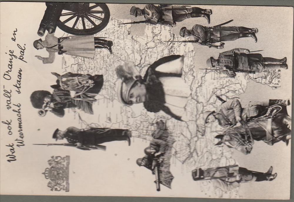 Foto van een (ansicht?)kaart "Wat ook vallm Oranje e...