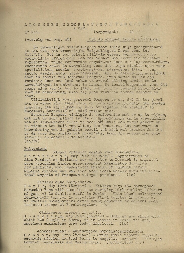 Algemeen Nederlandsch Persbureau, mededelingen, 17 m...