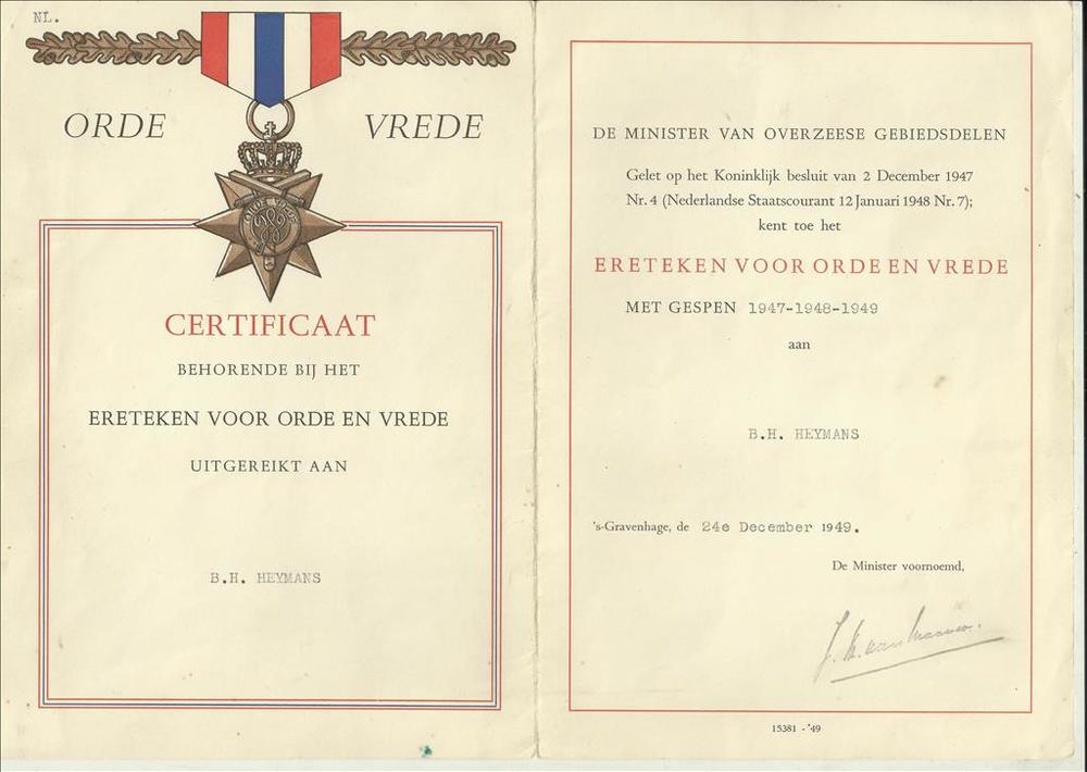 Certificaat behorende bij het Ereteken voor Orde en ...