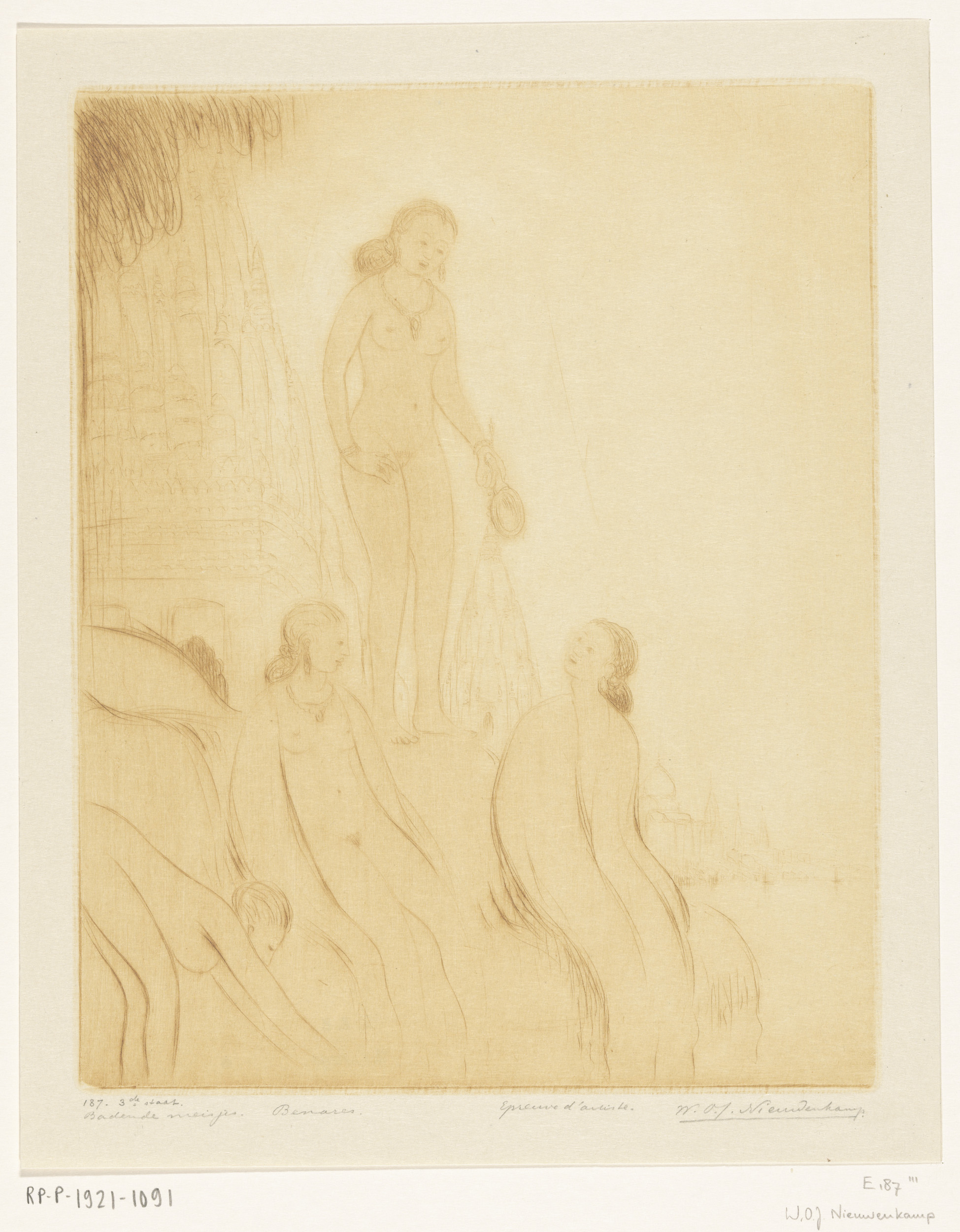 Badende meisjes op de oever van de Ganges in Benares