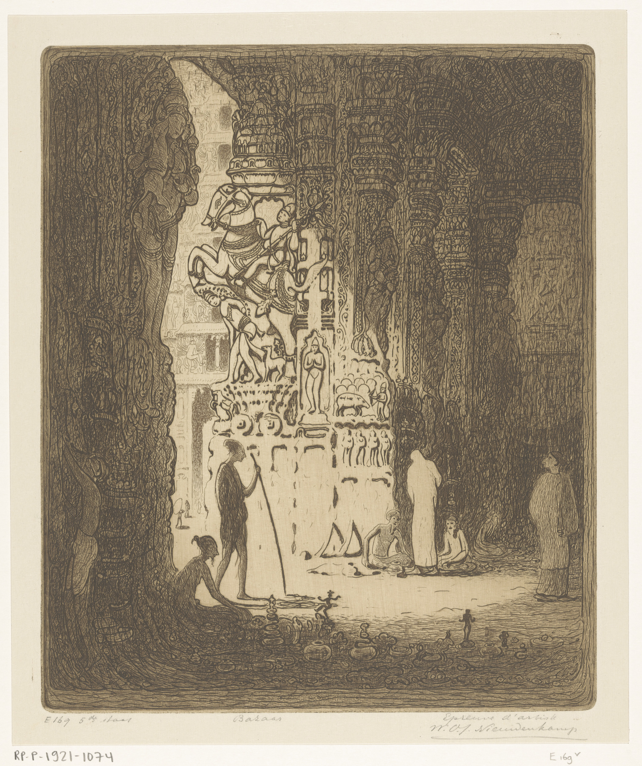 Figuren bij de ingang van een tempel in Brits-Indië